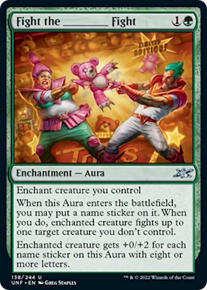 Enchanted creature gets +0/+2 for each name sticker on this Aura with eight or more letters.Manufacturer:Wizards of the CoastCard Name:Fight the _______ FightAttribute/MTG:Color:GreenAdditional Description:Fight the _______ Fight
