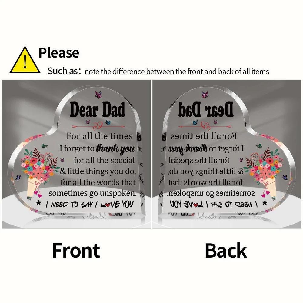 Free and fast shipping , shipping take up 1-7 Business Days 30 Day Return Accepted EASY PAYMENT via PayPal, Credit Card, PayPal Credit, Google Pay... Figurine Gift for Dad Plaque Clear Carved Small Novelty Romantic Home Decor 1PC Heart-shaped Plaque Birthday Gifts for Dad, Acrylic Keepsake Paperweight for Father's Day Thank You Dad Gifts Desk Plaque Sign For Table Decor Material: Acrylic Size: 3.94X3.94inch/ 10x10cm Package: 1PCS Pay attention : 1.There is protective film on product opposite. You need to tear off the film before using. 2. There are difference between the front and back. REVIEWS The product came very well packaged. I'm very happy. thank you for everything. Seller strongly recommended. This is great! I definitely recommend! Product looks amazing Delivery was fast. Excellent seller, great communication. I advise everyone to buy it!