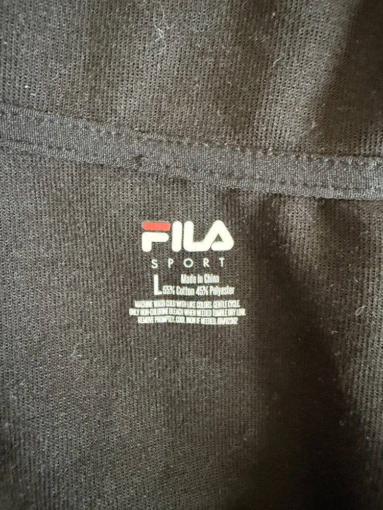 The Fila Black Zipped Coat Hoodie is a stylish and functional activewear jacket for women. Made of polyester, this long-sleeve hoodie features a solid black color with a zip closure and athletic fit. Perfect for outdoor activities or casual wear, this jacket is machine washable for easy care. The FILA brand ensures quality and style, making it a versatile addition to any wardrobe. Chest 39" Length 32" Sleeve 23.5" A7-167