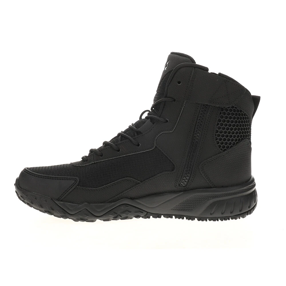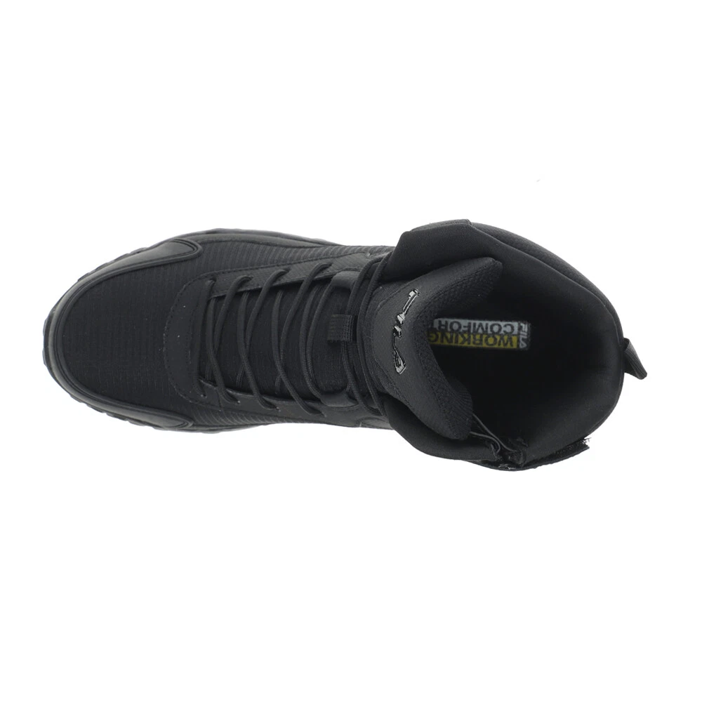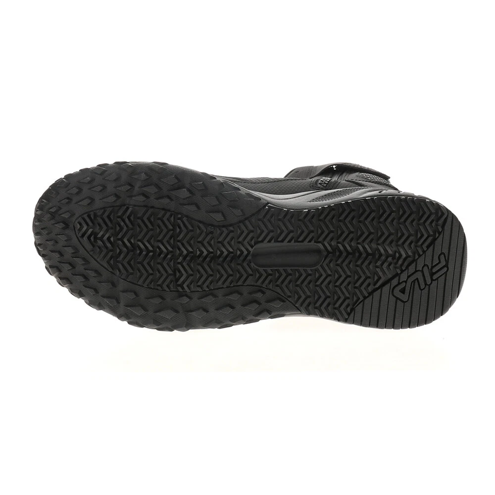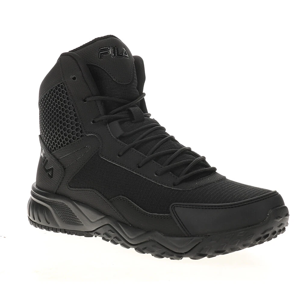 Chastizer Slip Resistant Work Boots Product Details Leather / mesh upper EVA midsole High ankle support with instep zipper closure Designed for the toughest jobs on the street and worksite, the Chastizer features a formidable high-top silhouette built in a durable and comfortable blend of leather, synthetics, and mesh. Soft memory foam cushioning helps keeps you comfortable during even the most strenuous work days. Additional Details Color: Black Occasion: Casual Gender: Mens Age: Adult Brand: Fila