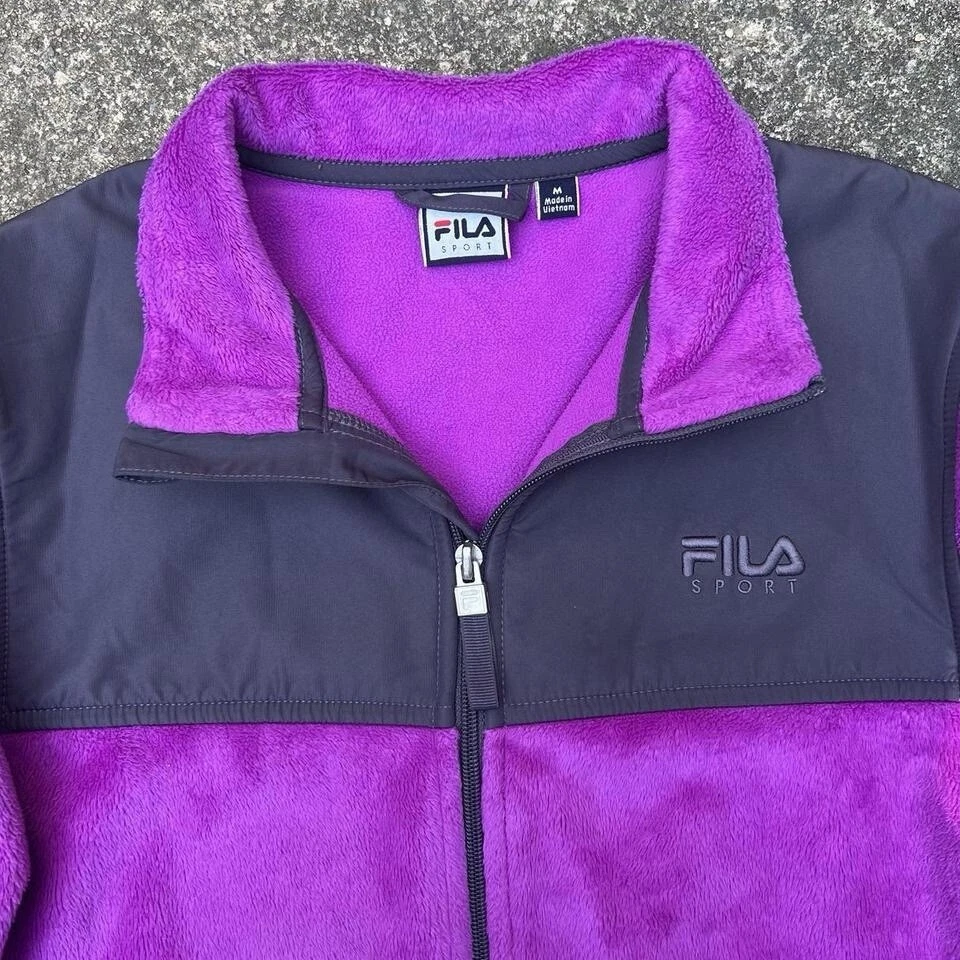 Fila purple and navy fleece jacket π€ this item is in great condition, with pocket on both sides, perfect for fall or winter season π pit to pit: 20β shoulder to hem: 26β size: Medium on tag #falloutfit #longsleeve #fleecejacket #fila #jacket winter fall season