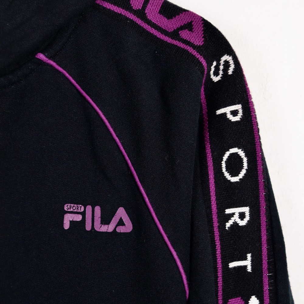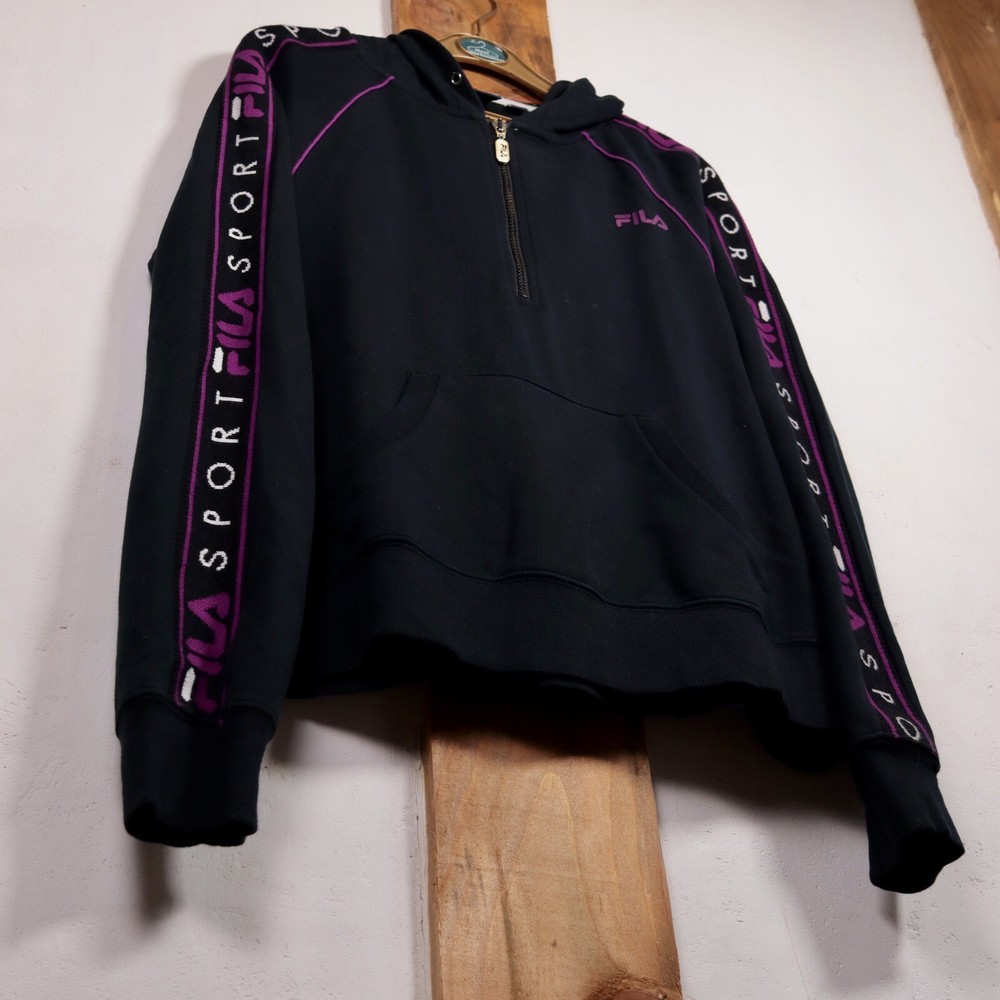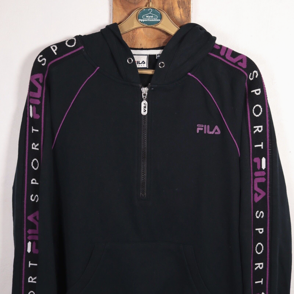 Rare Fila Sport 1/2 zip hoodie. Made polyester and cotton, this black hoodie features purple accents on the shoulder to sleeve trim, the side tape and logo, giving it a retro 90s sports vibe. Raglan sleeves, hooded. Machine washable for easy care. This is a rare item and is just stunning. The woven fila sport repeat logo on the tape is 🤌🏻 * The hood is missing the drawstring. MEASUREMENTS (Flatlay, approx): -Chest (pit to pit): 21 inches / 53 cm -Length: 23 inches / 59 cm -Sleeve (from underarm): 20.5 inches / 52 cm Most of our items are sent in 100% bio-degradable, recyclable mailing bags, or sometimes re-used packaging, to help the planet. UK shipping is Royal Mail Tracked 48 so you can keep up with the progress. Any questions, please ask - I normally reply within a few hours. Also, happy to consider offers.