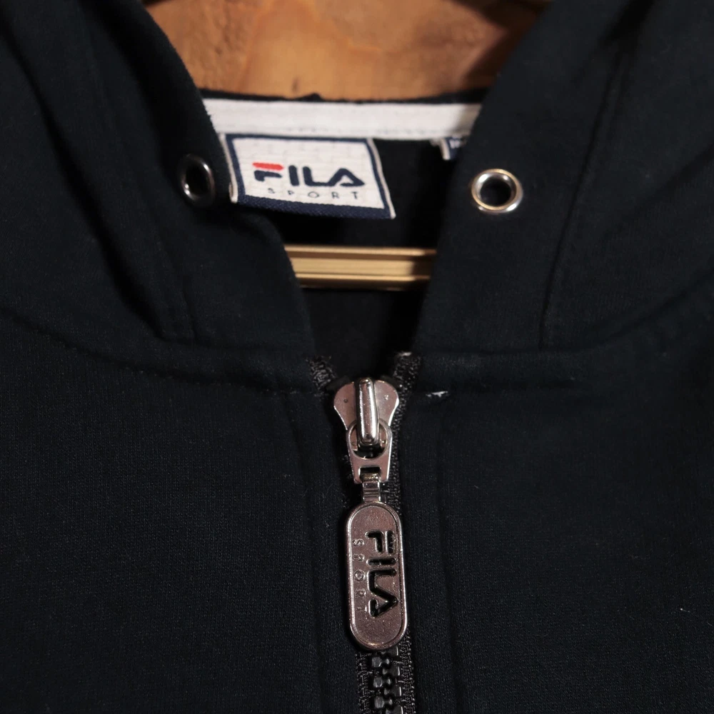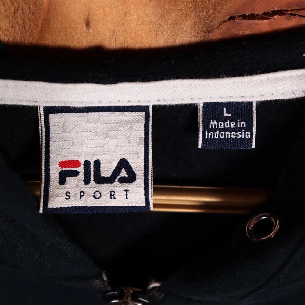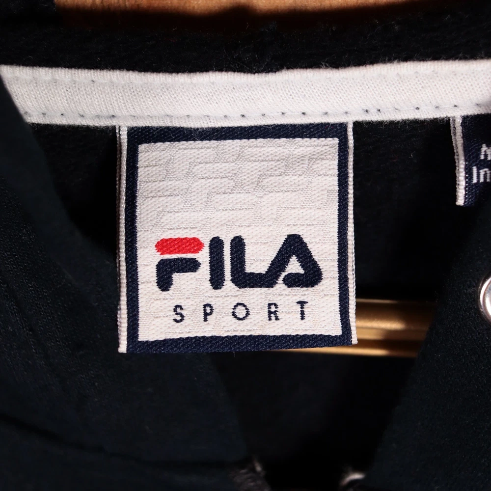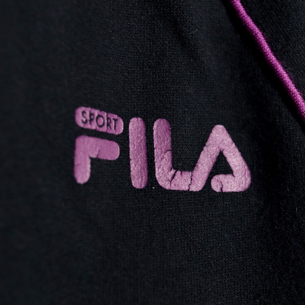 Rare Fila Sport 1/2 zip hoodie. Made polyester and cotton, this black hoodie features purple accents on the shoulder to sleeve trim, the side tape and logo, giving it a retro 90s sports vibe. Raglan sleeves, hooded. Machine washable for easy care. This is a rare item and is just stunning. The woven fila sport repeat logo on the tape is 🤌🏻 * The hood is missing the drawstring. MEASUREMENTS (Flatlay, approx): -Chest (pit to pit): 21 inches / 53 cm -Length: 23 inches / 59 cm -Sleeve (from underarm): 20.5 inches / 52 cm Most of our items are sent in 100% bio-degradable, recyclable mailing bags, or sometimes re-used packaging, to help the planet. UK shipping is Royal Mail Tracked 48 so you can keep up with the progress. Any questions, please ask - I normally reply within a few hours. Also, happy to consider offers.