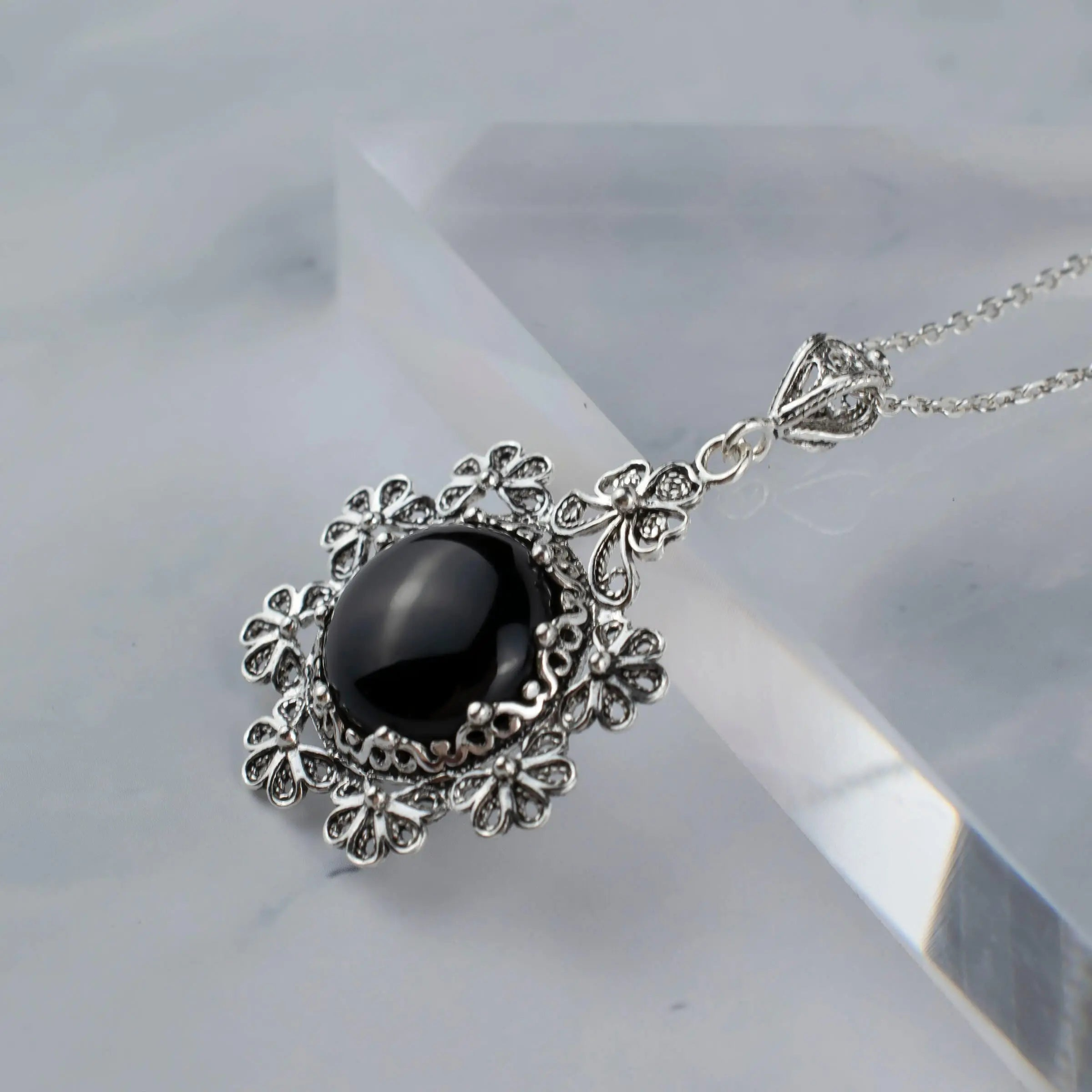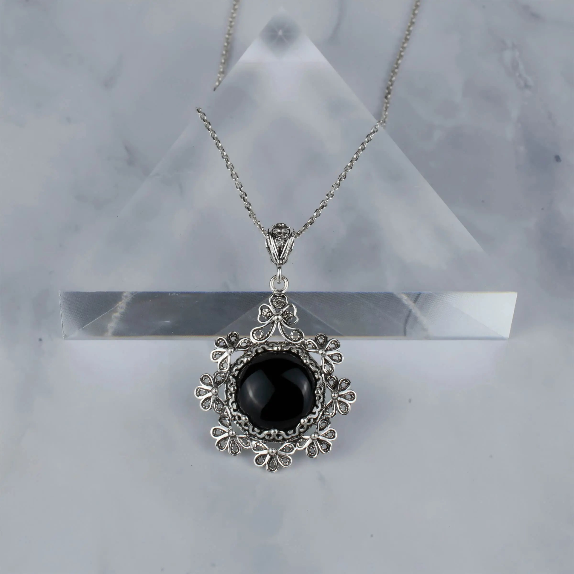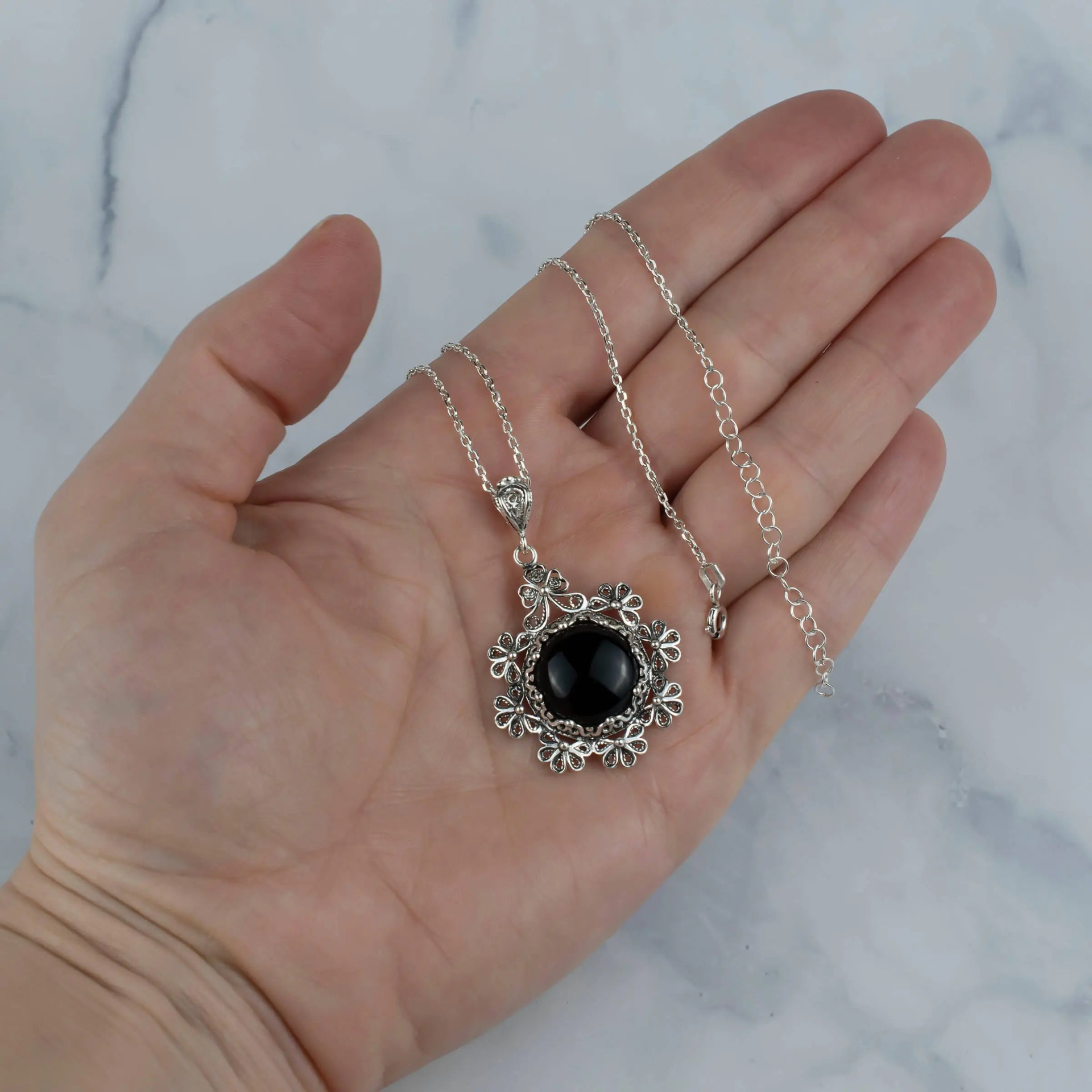 Make a statement with this handcrafted Sterling Silver Filigree Art Black Onyx Gemstone Women Floral Design Pendant Necklace. The intricate floral design is made from high-quality 925 sterling silver, while the stunning black onyx gemstone adds a touch of elegance to this standout piece. Crafted by skilled artisans, this pendant necklace is a one-of-a-kind piece that is perfect for any occasion. Whether you're dressing up for a special event or adding a touch of sophistication to your everyday style, this necklace is a must-have addition to your jewelry collection. The durable 925 sterling silver ensures that this pendant necklace will last for years to come, while the black onyx gemstone provides a timeless and classic look that will never go out of style. With its 18.00" + 2.00" extender silver chain and pendant height of 1.70" and width of 1.10", this necklace is a versatile piece that can be worn on its own or layered with other necklaces for a personalized look. Experience the beauty and elegance of filigree art and 15 mm round, cabochon cut black onyx gemstone for yourself by adding this handcrafted pendant necklace to your collection today!