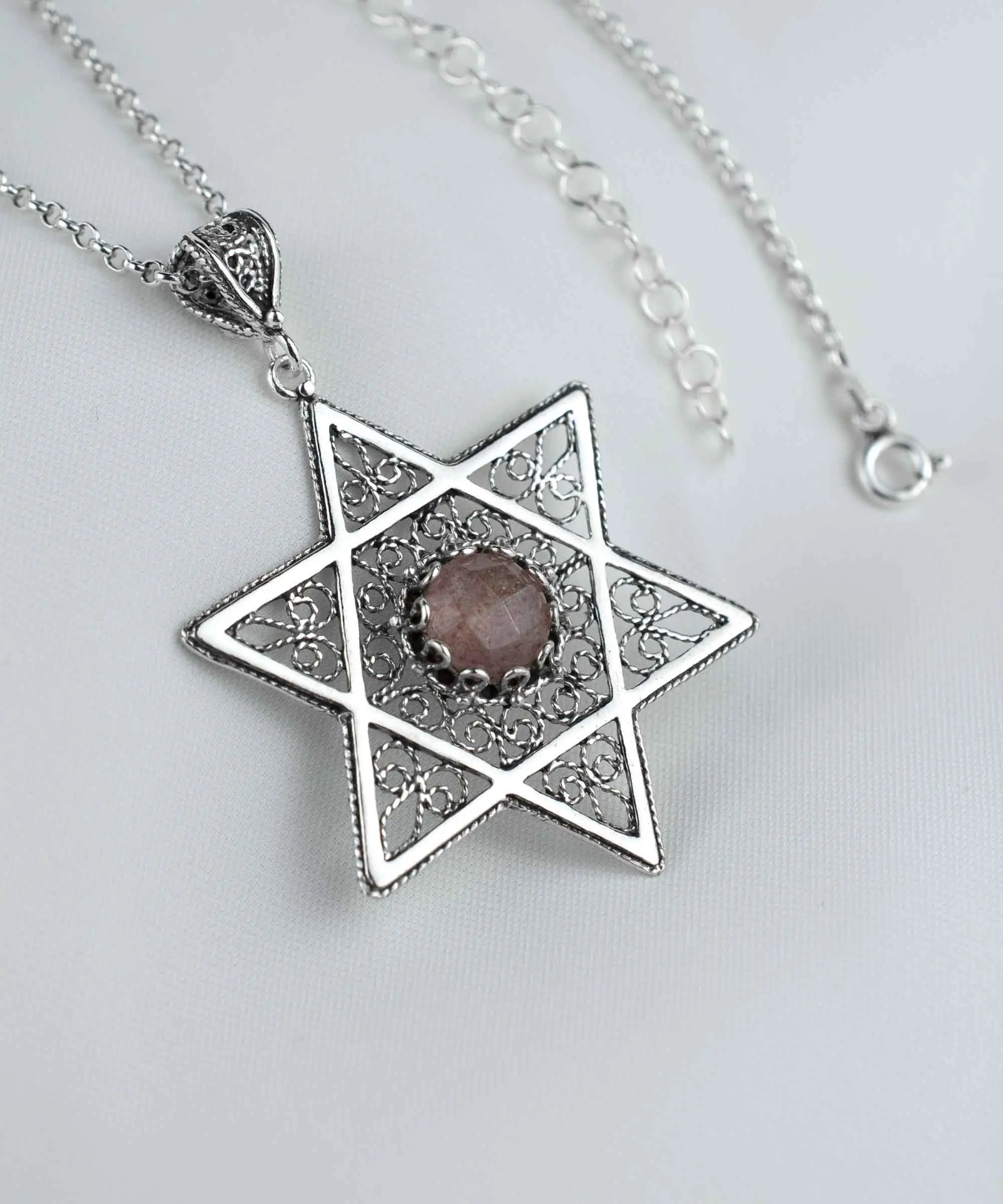 Elegant Quartz David Star Silver Pendant Necklace Introducing our exquisite cherry quartz david star silver pendant necklace, a true masterpiece that captures the essence of elegance and spirituality. This stunning piece features a 1.95-inch tall and 1.45-inch wide silver pendant, intricately designed with a Star of David filigree. It is further adorned with a mesmerizing pink cherry quartz gemstone, which adds a touch of sophistication and femininity. The handcrafted artistry of this silver filigree necklace is unparalleled. Each pendant is meticulously crafted by skilled artisans, ensuring that every detail is perfect. The intricate design and high-quality materials used in this pendant make it a standout accessory for any occasion. Whether you're attending a formal event or simply want to elevate your everyday style, this necklace is the perfect choice. The Star of David, a symbol of Jewish identity and faith, is beautifully represented in this pendant. It serves as a powerful reminder of tradition and heritage, making it a meaningful gift for yourself or a loved one. The pink cherry quartz gemstone not only enhances the visual appeal of the necklace but also carries its own significance. Known for its soothing and healing properties, cherry quartz is believed to promote love, balance, and positivity. This quartz david star silver pendant necklace is more than just a piece of jewelry; it is a testament to the rich tradition of filigree art and the timeless beauty of precious gemstones. The pendant's intricate design, combined with the elegance of the cherry quartz, makes it a versatile accessory that can be paired with any outfit. Whether you're dressing up for a special occasion or adding a touch of elegance to your everyday ensemble, this necklace is sure to make a statement. What sets this necklace apart from others is its meticulous craftsmanship and attention to detail. The silver pendant is not only beautiful but also durable, ensuring that it will remain a cherished piece in your jewelry collection for years to come. The pendant hangs gracefully from a delicate silver chain, completing the overall look of sophistication and elegance. If you're looking for a unique and meaningful piece of jewelry, this quartz david star silver pendant necklace is the perfect choice. It combines the beauty of filigree art, the symbolism of the Star of David, and the elegance of cherry quartz gemstones into one stunning accessory. Whether you wear it yourself or gift it to someone special, this pendant is sure to be treasured.
