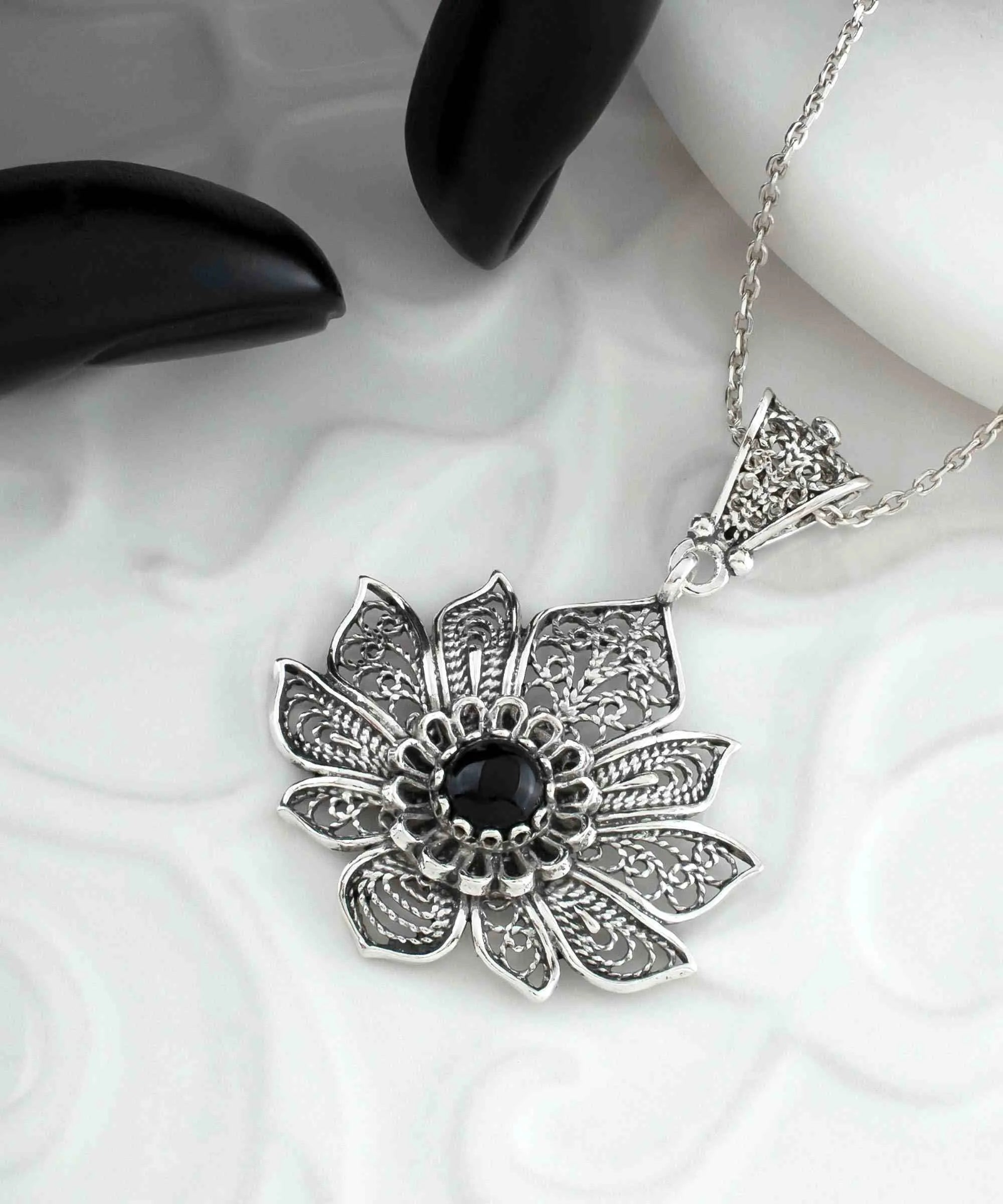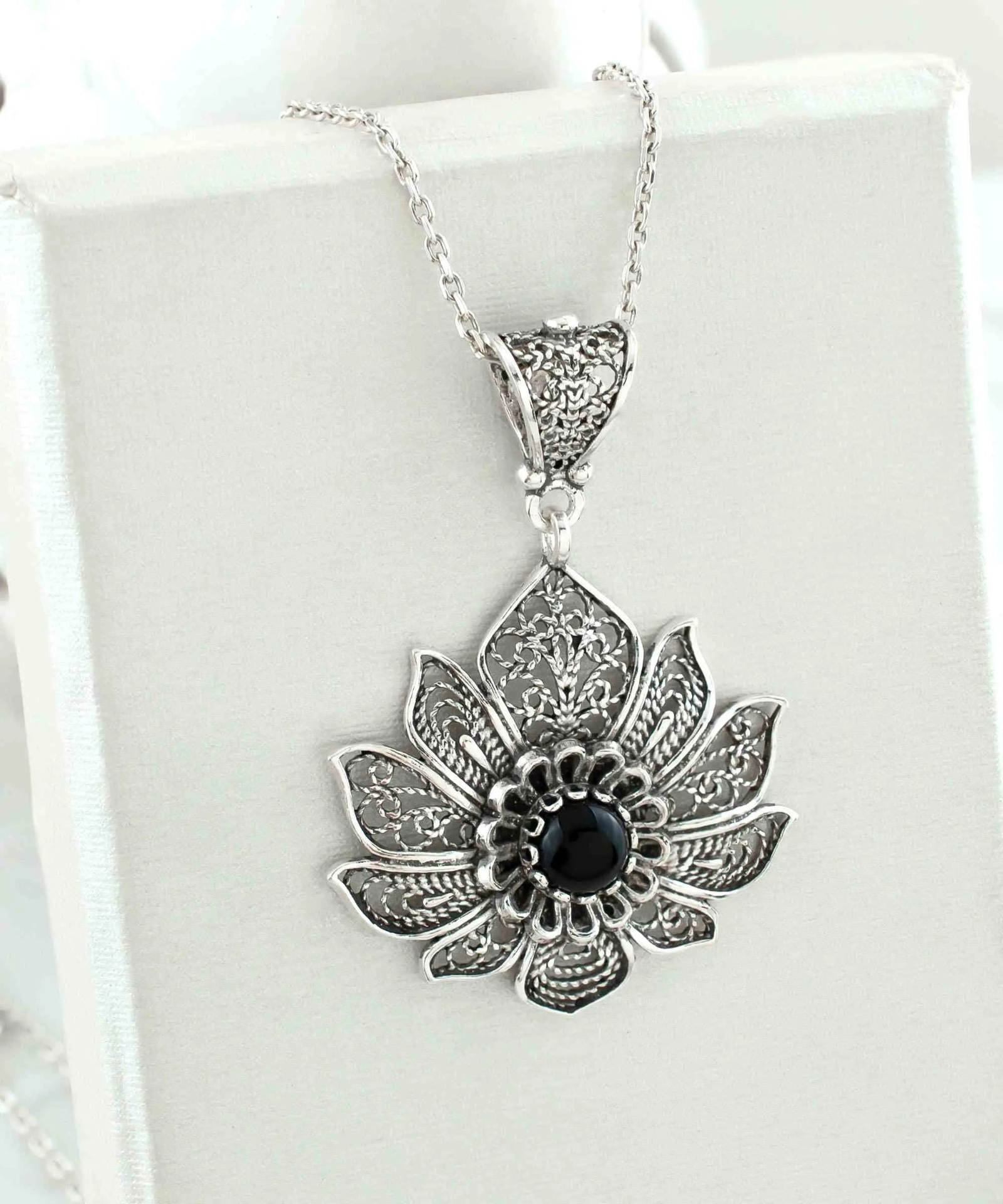 Introducing our exquisite handcrafted filigree art lotus flower figured black onyx gemstone women's 925 sterling silver pendant necklace! This piece of jewelry features a stunning black onyx gemstone that measures 6.00 mm in a cabochon round cut, set in a beautifully detailed lotus flower-shaped pendant made of 925 sterling silver. The pendant is 1.75 inches in height and 1.20 inches in width, and comes with a 20-inch silver chain. This necklace is perfect for any occasion and makes for a great gift option for Mother's Day, anniversaries, birthdays, Thanksgiving, New Year, Christmas, Valentine's Day, or any other special occasion. The necklace also comes with a silver polish cloth and a luxurious gift box, making it the perfect present for that special someone in your life. Made with the highest quality materials, this necklace is not only beautiful but also durable and long-lasting. With its unique design and exquisite craftsmanship, it's sure to become a cherished piece in your jewelry collection. Shop now and add a touch of elegance to any outfit with our handcrafted filigree art lotus flower figured black onyx gemstone women's 925 sterling silver pendant necklace!