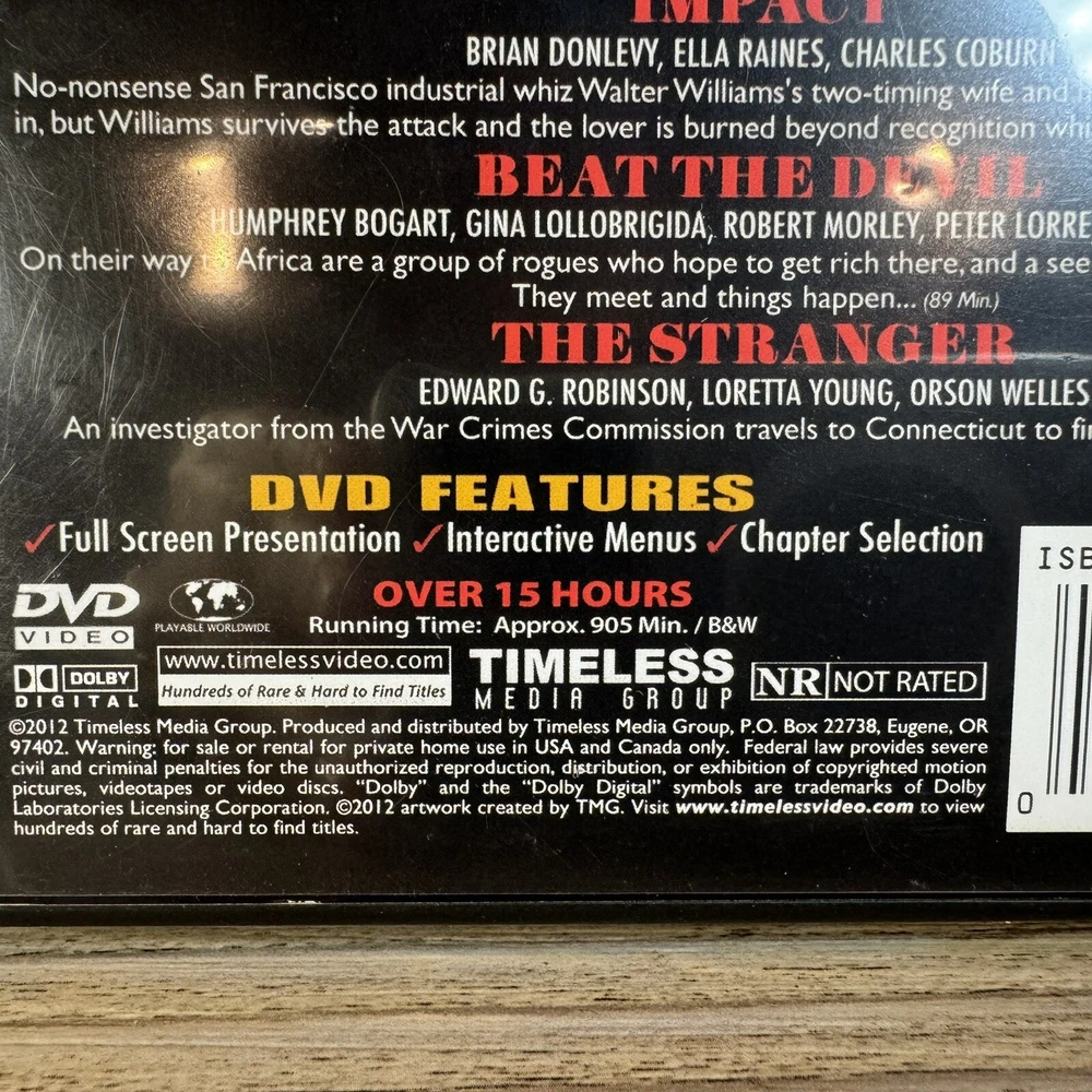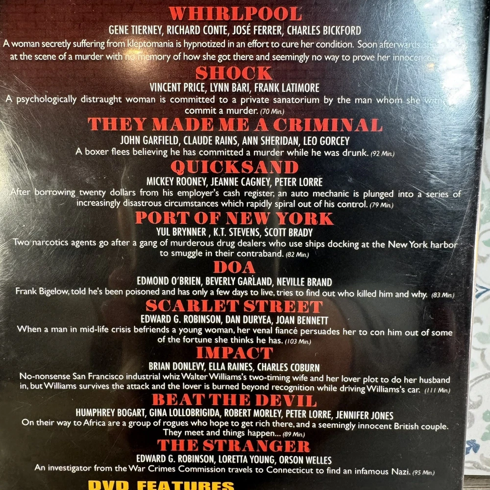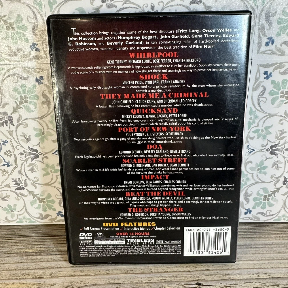 Studio: Timeless Media Genre: Mystery / Suspense Format: DVD gtin13: 0011301634061 Rating: NR Case Type: Tall/DVD Case Language: English Actor: Edward G. Robinson, Gene Tierney, Humphrey Bogart, Orson Welles, John Garfield Director: Fritz Lang Movie/TV Title: Film Noir Collection Type: Movie Cinematic Movement: Film Noir Sub-Genre: Film Noir Region Code: DVD: 0/All (Region Free/Worldwide) UPC: 0011301634061