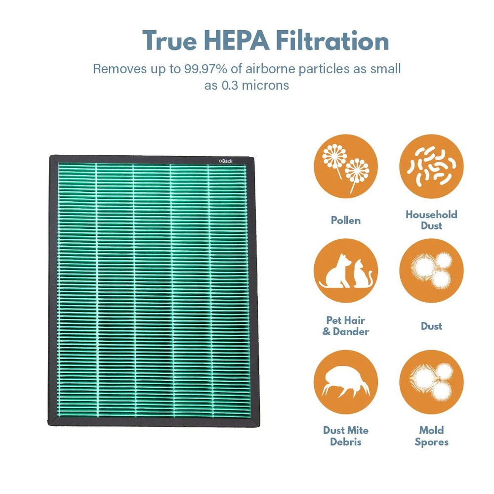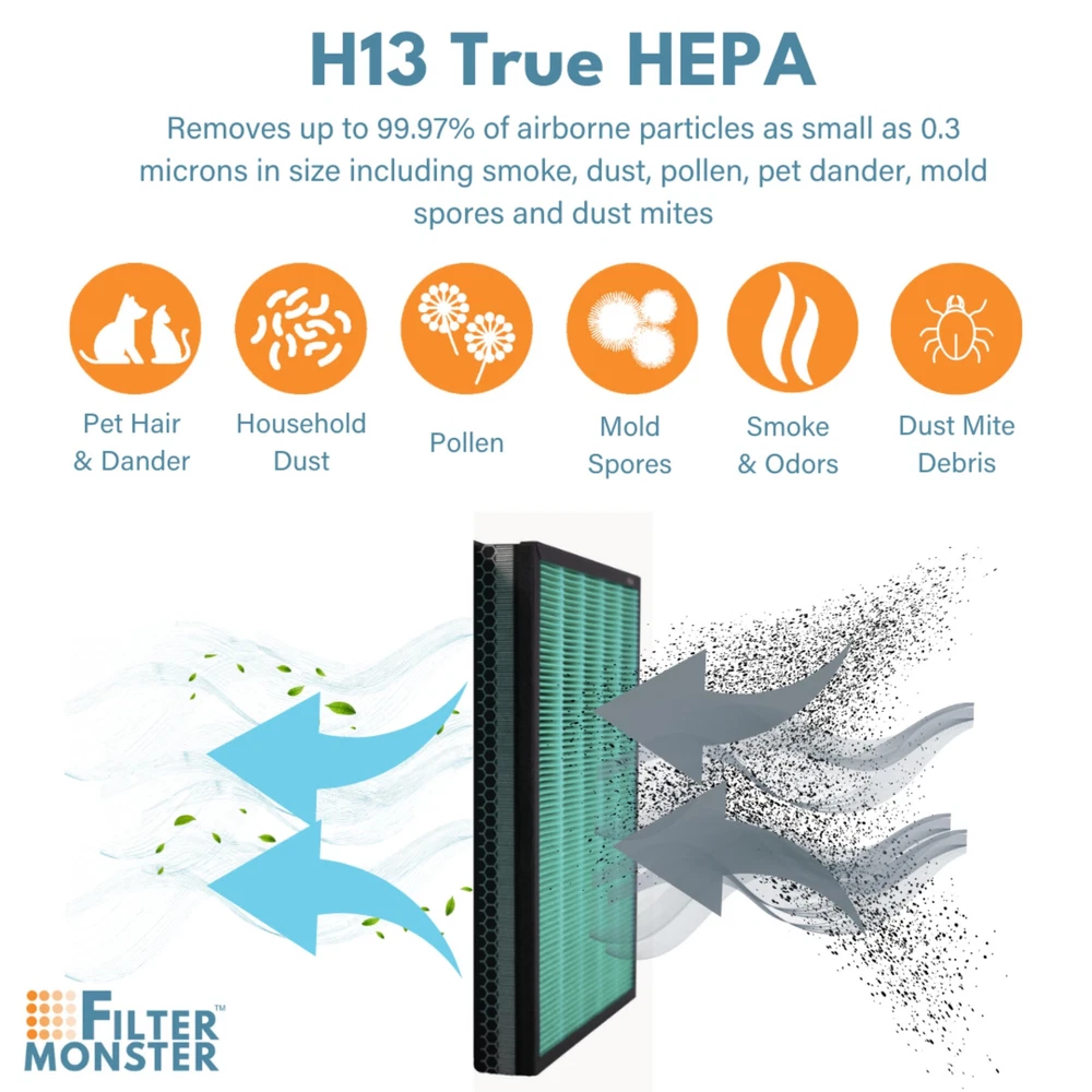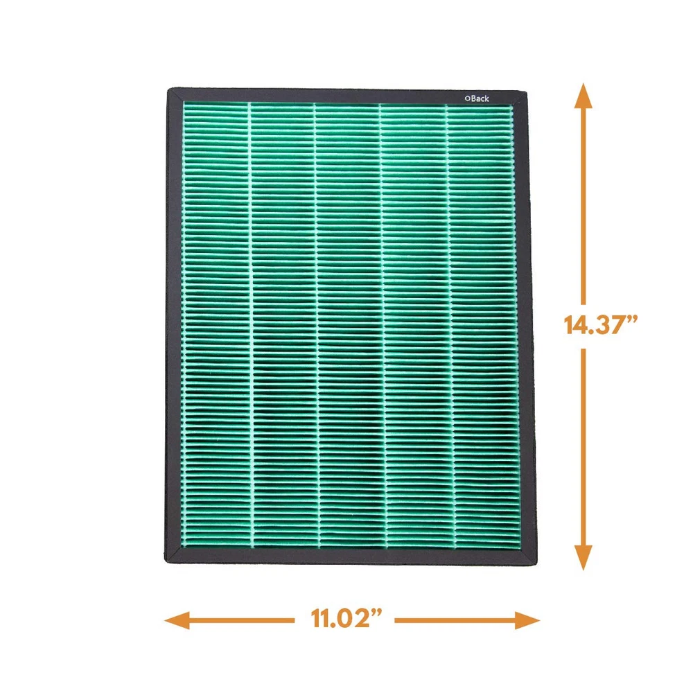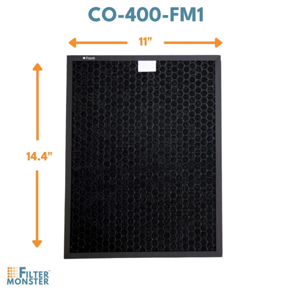 Model Compatibility: Filter-Monster True HEPA Replacement with Carbon Filter Set compatible with Coway 400/400S Airmega Max 2 filter. Engineered to fit Coway Airmega 400 and 400S air purifiers. Activated Carbon: The Filter-Monster HEPA Replacement Air Filter has integrated carbon that reduces household odors and VOCs (volatile organic compounds) from cooking, cleaning chemicals, and smoke. True HEPA filtration: HEPA filter replacement captures up to 99.97 percent of particles as small as 0.3 microns including smoke, dust, pollen, pet hair and dander, mold spores, and dust mites. Improve the air quality in your home all year round. Replacement Time: Depending on air quality environment and usage, it is recommended to replace the HEPA filter every 12 months to help ensure the Coway Airmega air purifier is running efficiently. Dimensions: Filter-Monster True HEPA Replacement with Carbon Filter Set compatible with Coway 400/400S Airmega Max 2 filter. The air filters approximate dimensions are: 14.37" x 11.02" x 1.77”. Included in the package are two (2) replacement filters.