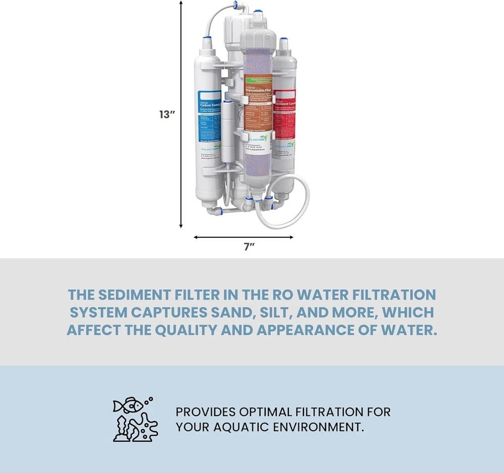 Capacity: 50 gal Item Package Dimensions L X W X H: 16.1 X 10.12 X 5.28 Inches Number of Filtration Stages: 4-Stages Size: 50-gallon Four Stage Package Information: Unit Type: Water Filter Target Audience Keyword: Fish Maximum Flow Rate: 180 Liters Per Day Estado del artículo: Nuevo Item Depth: 7.5 in Color: White Specific Uses For Product: Active Brand: Unbranded Number in Pack: 1 Installation Type: Freestanding Global Trade Identification Number: 00810957010195 Power Source: Corded Electric Contaminant Removal: Total Dissolved Solids Item Weight: 3.9 lb UPC: Does Not Apply Suitable For: Household, Aquarium Material: Plastic, Resin Item Dimensions Lxwxh: 13.75 X 7.5 X 6 Inches gtin13: Does Not Apply Compatible Model: Aquatic Life RO Buddie Age Range Description: All Ages Special Feature: Heavy Duty Filtration Method: Reverse Osmosis, Deionization Number Of Items: 1 Model: Reverse Osmosis Water Filter System Product Dimensions: 13.75"l X 7.5"w X 6"h