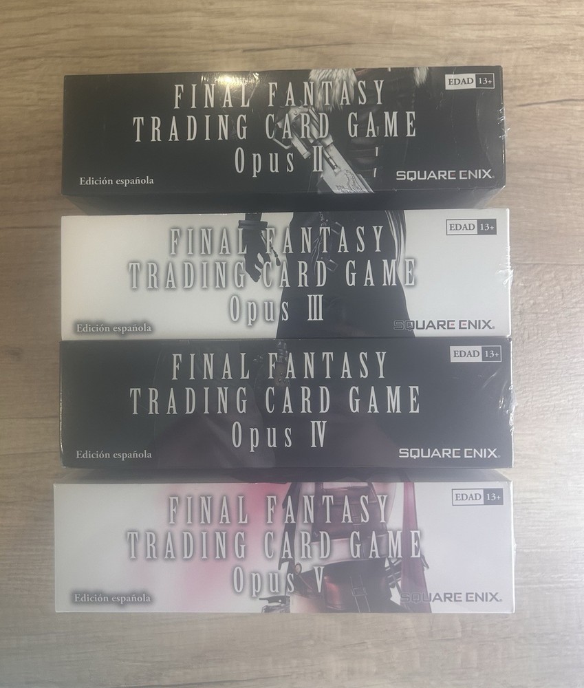 These products are brand new booster boxes of Final Fantasy TCG Opus 2, 3, 4 & 5 cards, manufactured by Square Enix. These factory-sealed boxes contains a total of 144 sealed packs. The cards are standard size and suitable for players aged 13 and above. The booster box features cards from the Opus 2, 3, 4 & 5 set, providing players with a chance to collect and trade cards for the popular Final Fantasy Trading Card Game. This product is a must-have for any Final Fantasy TCG fan looking to expand their collection with cards in Spanish language. All boxes are fully sealed and un-opened. You are purchasing all 4 boxes - Opus 2, 3, 4 & 5.