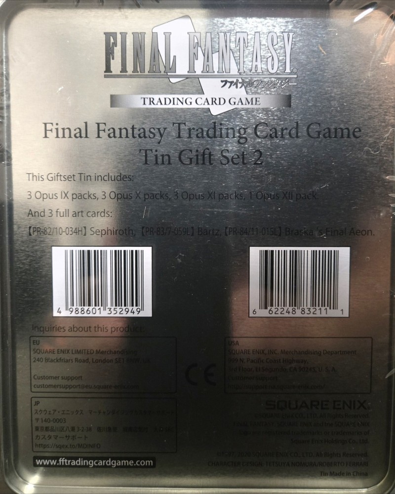 FINAL FANTASY TCG TIN GIFT SET #2 | SEALED THIS GIFT SET TIN INCLUDES: 3 OPUS IX PACKS 3 OPUS X PACKS 3 OPUS XI PACKS 1 OPUS XII PACK 3 FULL ART CARDS: SEPHIROTH [PR-82/10-034H] BARTZ [PR-83/7-059L] BRASKA'S FINAL AEON [PR-84/11-015L] ALL SALES FINAL, THANK YOU