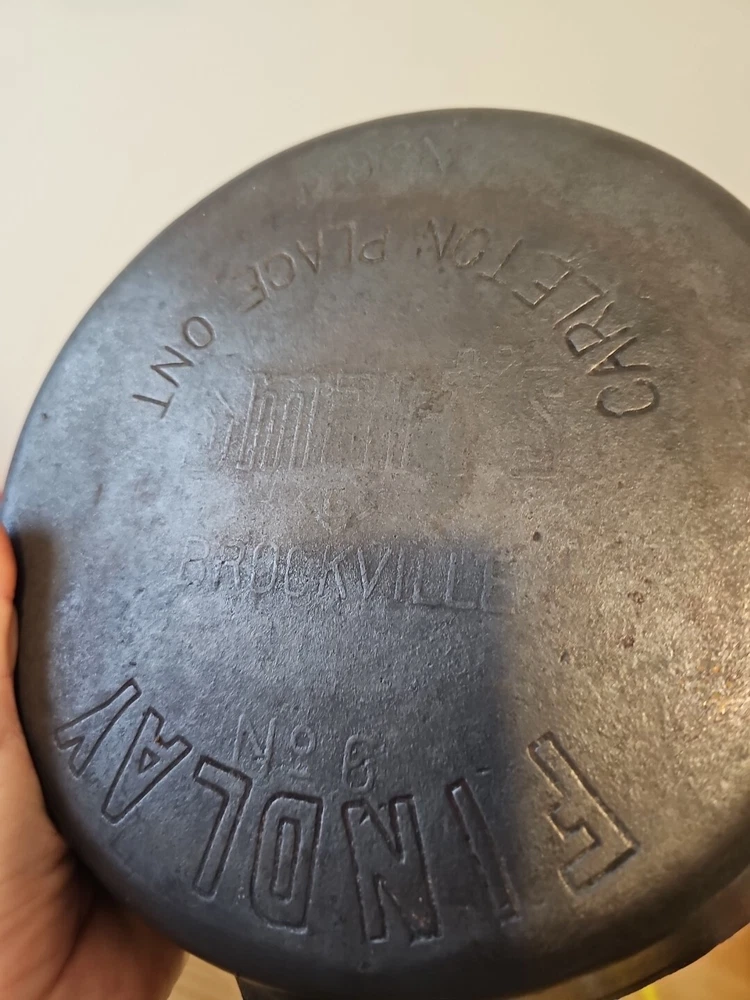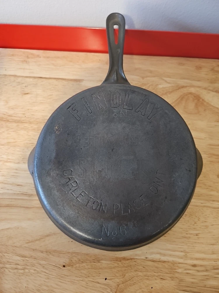 Findlay cast Iron Pan Made In Ontario, Canada. Number 6, pan sits flat, no wobble or spin, no cracks or pitting. See photos for better description.
