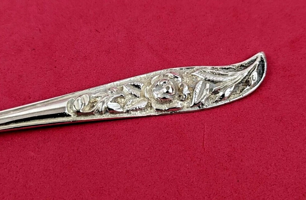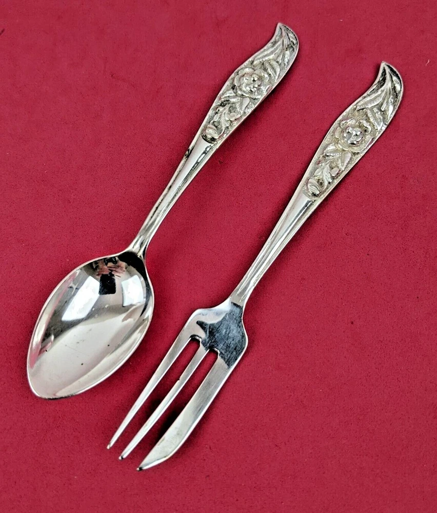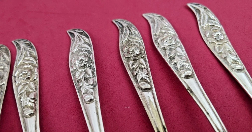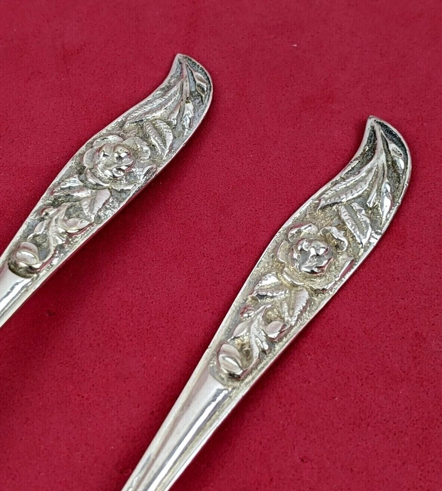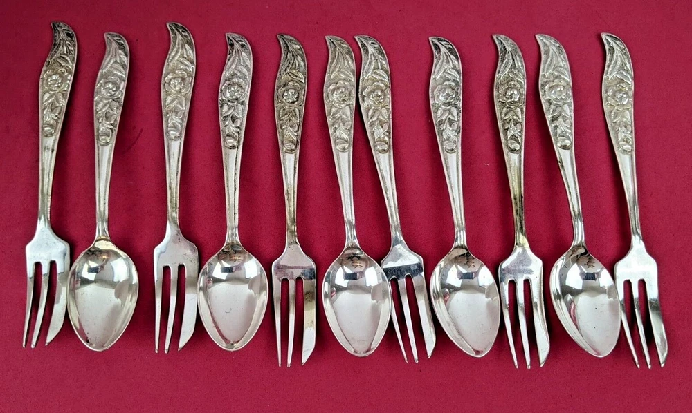 An antique Silver Dessert Set that I believe was purchased in France or Germany in the 1940s. All of the handles have a deep carved Rose pattern. There are 6 Pastry or Pie Forks that are 5 3/4" in length and 5 Coffee Spoons that are 5 5/8" in length. There are no markings or hallmarks that I can find. They are heavy quality piec es in very good well preserved condition.