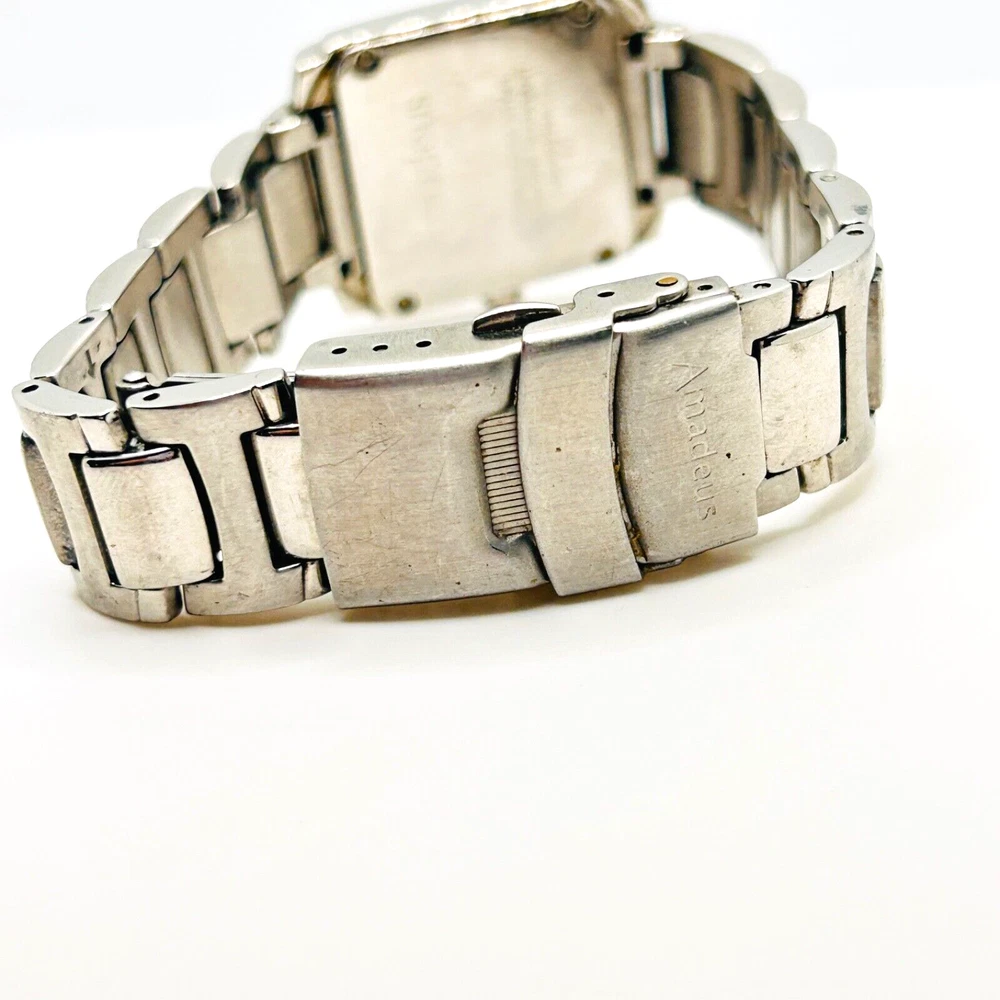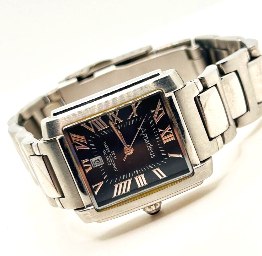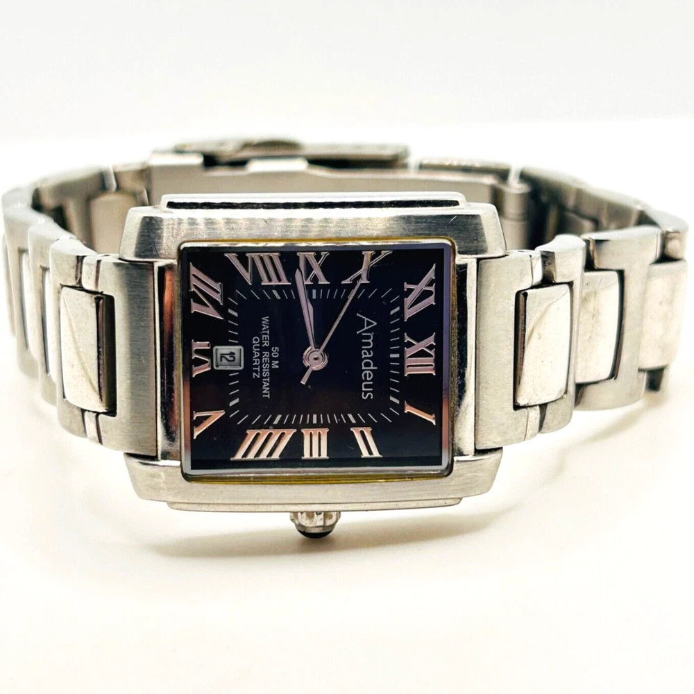 This is a beautiful Wristwatch by the maker Amadeus Set in Stainless Steel with a gorgeous Black Watch Face and Silver coloured Watch Hands marked on the back 'ALL STAINLESS STEEL BACK 50M WATER RESISTANT AM00017BK EC' This piece has a date indicator in good working order The watch face measures approx. 28mm wide Aesthetically and Mechanically in fantastic condition Battery has been replaced recently and keeps time Would make a lovely gift for that someone special PLEASE NOTE THAT I DO MY UP MOST TO MAKE SURE ALL ITEMS ARE IN GOOD CONDITION UNLESS OTHERWISE STATED BUT THEY ARE MOSTLY ANTIQUE OR VINTAGE ITEMS SO A LITTLE AGE RELATED WEAR IS TO BE EXPECTED, PLEASE DO TAKE THIS INTO CONSIDERATION WHEN LEAVING FEEDBACK. IF NOT BOXED IN THE PHOTO IT WILL BE WRAPPED IN BUBBLE TO PROTECT IT IF I HAVE ANY-BOXES AT THE TIME I WILL SOMETIMES BOX THEM BUT UNLESS STATED IT WONT BE IVE BEEN ON EBAY ALONG TIME MY CUSTOMERS ARE VERY IMPORTANT TO ME SO PLEASE ASK ME IF ANYTHING IS NOT RIGHT AND I WILL TRY AND SORT IT OUT ASAP ALSO IF FOR ANY REASON YOU ARE UNHAPPY WITH YOUR ITEM, PLEASE LET ME KNOW AND I WILL BE HAPPY TO ISSUE A REFUND UPON RECEIPT OF THE ITEM . I HAVE A NO QUIBBLES RETURN POLICY. AND LASTLY THANKYOU SO VERY MUCH FOR YOUR CUSTOM
