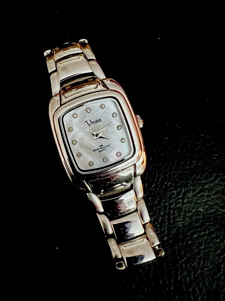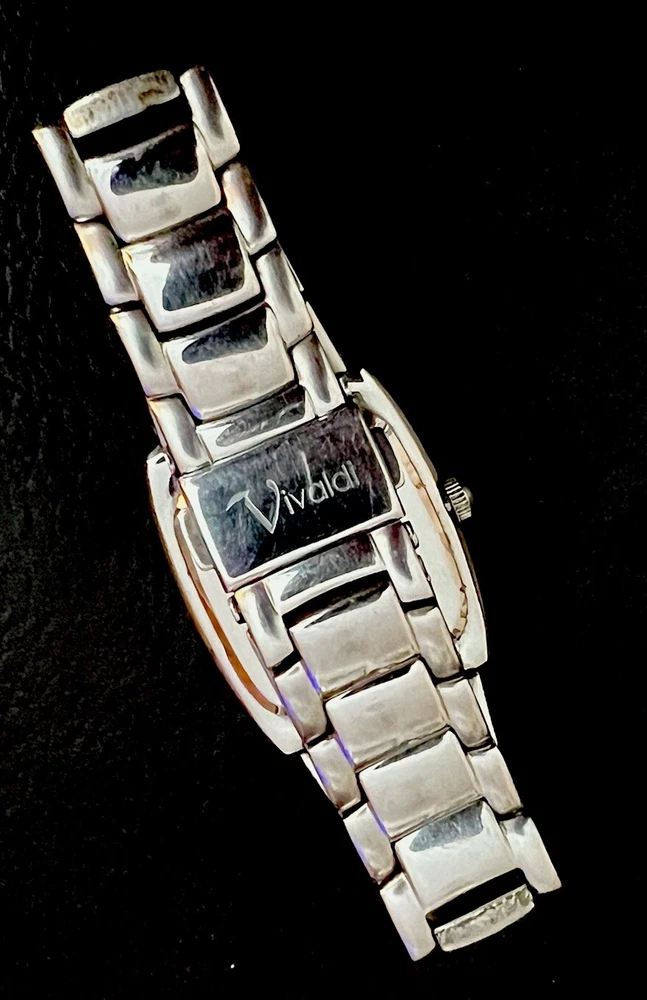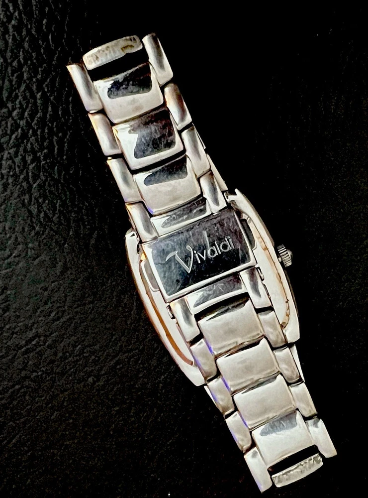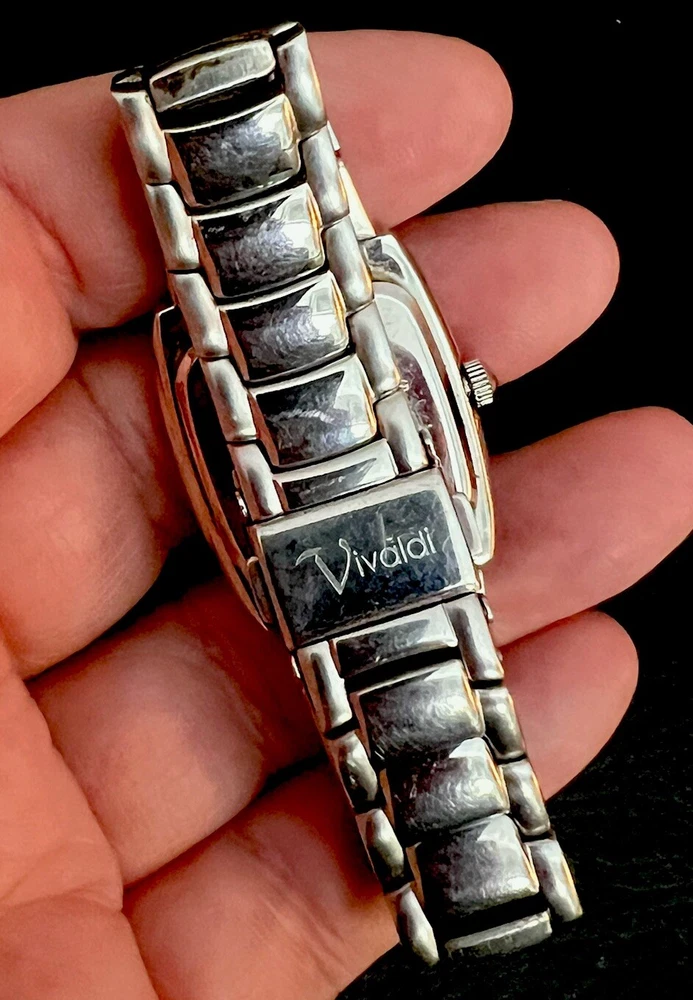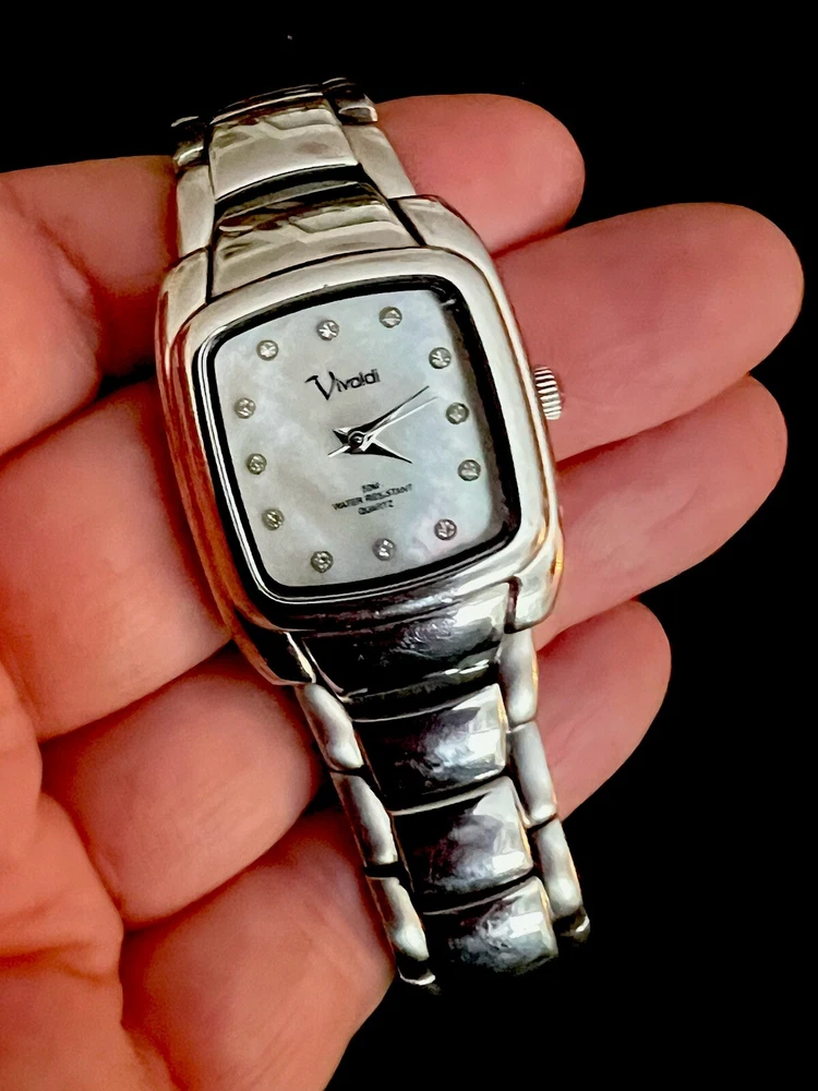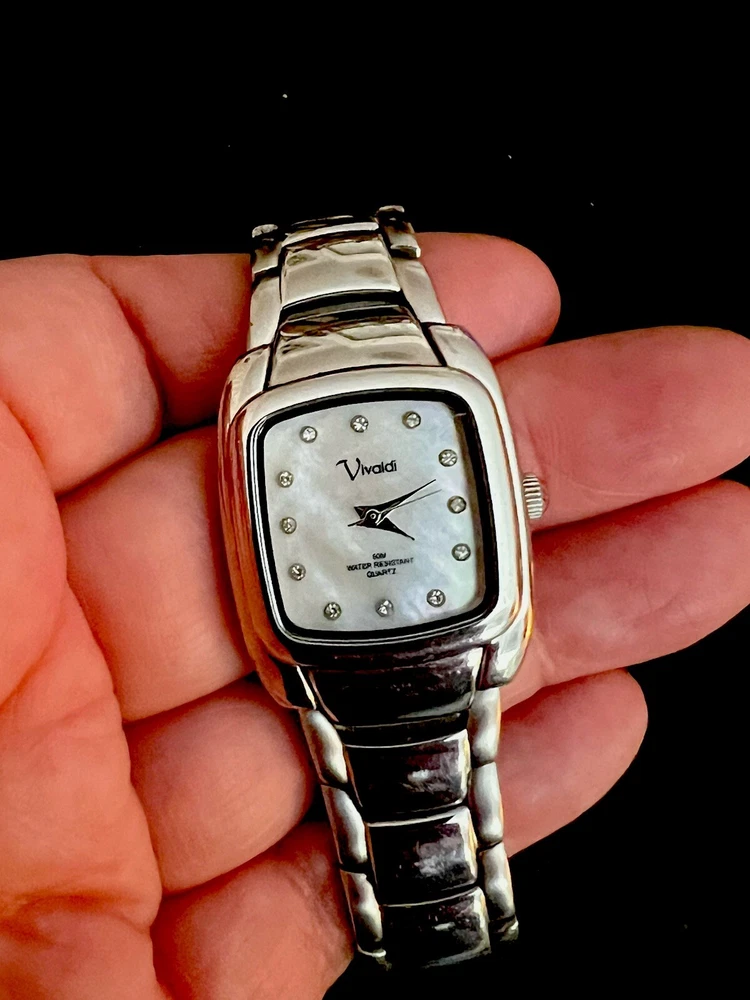 This is a beautiful Wristwatch by the maker Vivaldi Set in Stainless Steel with a gorgeous classic Mother of Pearl Watch Face and Silver coloured Watch Hands marked on the back 'ALL STAINLESS STEEL 50 METERS WATER RESISTANT V0019 EI' set with gorgeous Bright White Crystals in the Dial. Stunning sparkly piece The watch face measures approx. 28mm wide Aesthetically and Mechanically in fantastic condition Battery has been replaced recently and keeps time Would make a lovely gift for that someone special PLEASE NOTE THAT I DO MY UP MOST TO MAKE SURE ALL ITEMS ARE IN GOOD CONDITION UNLESS OTHERWISE STATED BUT THEY ARE MOSTLY ANTIQUE OR VINTAGE ITEMS SO A LITTLE AGE RELATED WEAR IS TO BE EXPECTED, PLEASE DO TAKE THIS INTO CONSIDERATION WHEN LEAVING FEEDBACK. IF NOT BOXED IN THE PHOTO IT WILL BE WRAPPED IN BUBBLE TO PROTECT IT IF I HAVE ANY-BOXES AT THE TIME I WILL SOMETIMES BOX THEM BUT UNLESS STATED IT WONT BE IVE BEEN ON EBAY ALONG TIME MY CUSTOMERS ARE VERY IMPORTANT TO ME SO PLEASE ASK ME IF ANYTHING IS NOT RIGHT AND I WILL TRY AND SORT IT OUT ASAP ALSO IF FOR ANY REASON YOU ARE UNHAPPY WITH YOUR ITEM, PLEASE LET ME KNOW AND I WILL BE HAPPY TO ISSUE A REFUND UPON RECEIPT OF THE ITEM . I HAVE A NO QUIBBLES RETURN POLICY. AND LASTLY THANKYOU SO VERY MUCH FOR YOUR CUSTOM