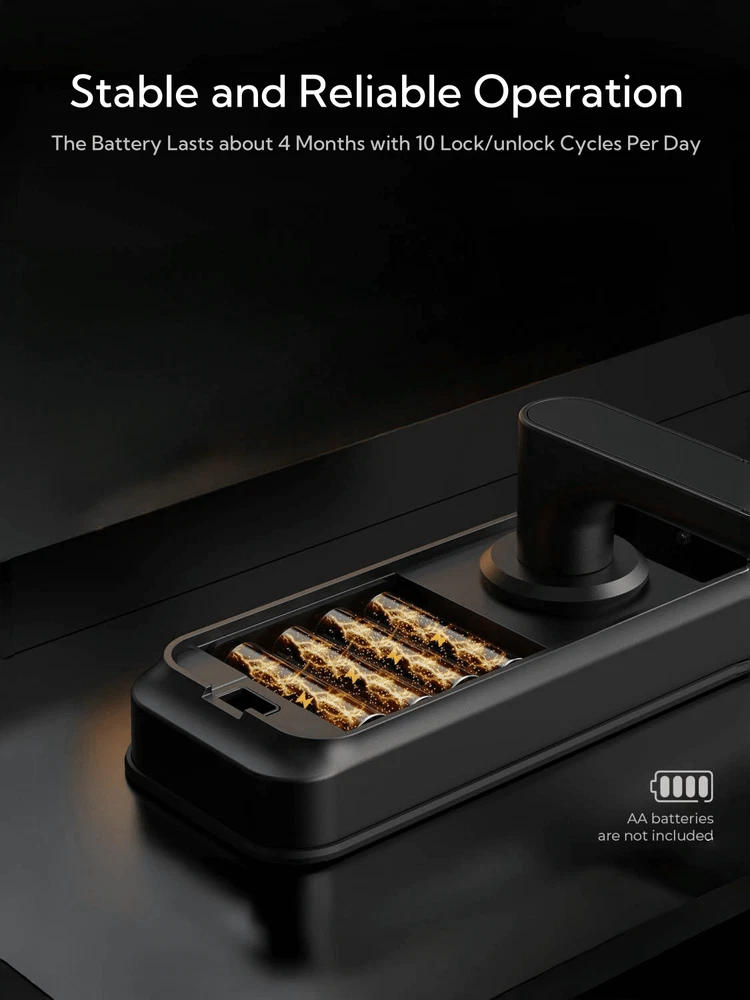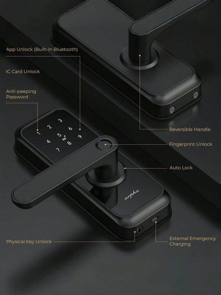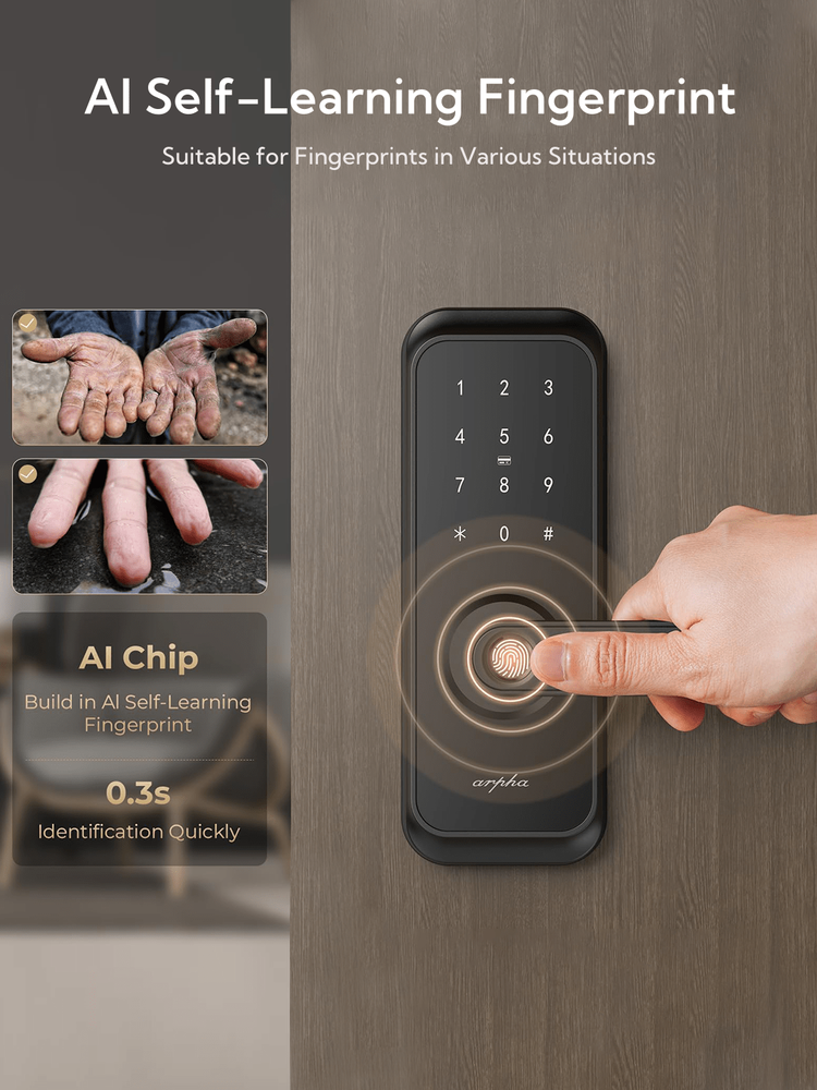 5 Ways to Unlock: Arpha keyless entry door lock could be unlocked via APP Access, Fingerprint Touch ID, Keypad Code, Fob, Traditional Key Unlock. Never get locked out again with multiple secure ways to access your home. APP Control: Keyless entry door lock deadbolt with handle set boasts an intuitive APP control, offering you the convenience of access management, user code editing, and tracking entry records from your smartphone. Arpha Gateway required for remote control this keyless entry door lock. AI Fingerprint door lock: Your Finger is Your Key! Fingerprint door lock recognition gets more precise with every touch, so you don't have to try agian and again to get in. Never be awkward or upset at unlocking the door. Anti-Peeping Password: Our electronic keypad door lock is equipped with an anti-peeping password function, providing enhanced security by masking your access code, deterring potential intruders. the door lock provides virtual password unlocking function. Users could enter 6~10 fixed password + 12~8 virtual password to unlock. Easy Installation: Smart door lock could easily be installed in few minutes with a screwdriver. Keyless entry door lock is suitable for backset scale range of 2-3/8 inches (60mm) and 2-3/4 inches (70mm), with door thickness ranging from 1-3/8 inches to 2-1/8 inches (35mm-55mm). Unlock Methods: Key, Fingerprint Recognition, NFC, APP Control, Fob Unlock, Passcode Unlock Color: Black Power Supply: Battery Powered(Others Battery) Batteries Included: No