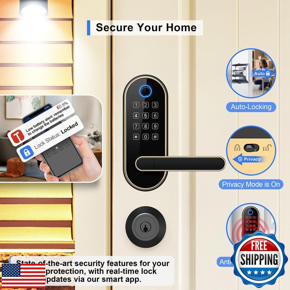 Keyless-Entry Keypad Fingerprint Smart Lock: Digital Door Lock with Code Passcode, Electronic Door Handle, Biometric Door Knob for Entry Door, Bedroom Door (Gold) Features [Fingerprint Unlock - Family Friendly] Unlocking with a fingerprint takes just 0.3 seconds, offering quick access for family members; our 508 DPI high-resolution fingerprint sensor ensures up to 99.99% recognition rate; track all unlocking history using the smart app. [Code Unlock - Guest Friendly] Remotely create instant or scheduled door codes for family, visitors, and guests using the smart app, even when you are not at the property; ideal for homeowners, rental hosts, and property managers. [Secure Your Home] Automatic door locking to ensure your door is always locked after you leave; an alarm will trigger if unwanted intruders try to enter; privacy mode disables all access methods from outside when you need it; stay informed about your door's activity with all security alerts pushed to your smart app. [One Card, All Locks] Use one card to unlock all doors, eliminating the need to carry multiple keys and the confusion of which key is for which door; this feature is especially friendly for property managers who manage many properties. [Voice Control] Works with Amazon Alexa and Google Assistant for hands-free control through voice commands like "lock the front door”, "unlock the front door”, "check lock status”, etc. (Gateway Required, Sold Separately) [Locks Management] Manage all the locks via the smart app and web portal; log in web portal with your app credentials. [Easy Installation] Easy to install with just a screwdriver in 20 mins; no extra drilling needed; no hardwiring; door handle is reversible for both right-handed and left-handed doors. Shipping Free & Fast Shipping: We offer free shipping to most of the USA with a normal delivery time of 3-7 days. However, due to the current situation, additional delivery time (up to 3 weeks) may be required for some items. Alternative Carriers: We may use alternative carriers (e.g., USPS, FedEx, UPS) to ensure your package arrives safely and on time. Due to the use of multiple carriers, we are unable to provide a tracking number automatically. Handling Time: Orders are processed and shipped within 1-2 business days of receiving cleared payment. Shipping Restrictions: Shipping to Alaska, Hawaii, Puerto Rico, Guam, and other US territories may incur shipping charges or delivery restrictions. Please contact us before ordering, or your order can be refunded/cancelled. State Restrictions: Certain items may not be shipped to California due to state regulations. Contact for Tracking Updates: If you require tracking updates or have any concerns about the delivery of your order, please feel free to contact us, and we will be happy to assist you. Return Policy 30-Day Hassle-Free Returns: If you are not completely satisfied with your purchase, you can return the item for free within 30 days of receiving it for a full refund or exchange. Easy Return Process: Contact us, and we will provide you with a prepaid return shipping label and detailed instructions. No Restocking Fee: There are no restocking fees for returns. However, the buyer is responsible for return shipping costs if the return is not due to a seller's error. Refund Processing: Refunds will be processed within 1 business day of receiving the returned item in its original condition. Payment We accept all major credit cards, PayPal, and Apple Pay for your convenience. Your payment information is secure and encrypted to ensure a safe and seamless transaction. Please complete your payment within 3 days of purchase to avoid any delays in shipping. Feedback Your feedback is extremely important to us. We strive to provide the best products and customer service possible. If you are satisfied with your purchase, please take a moment to leave us a positive review. If you have any concerns or issues with your order, please contact us before leaving negative feedback. We are committed to resolving any problems and ensuring your satisfaction. Contact Us If you have any questions or concerns, please feel free to reach out to our customer support team. You can contact us through the eBay messaging system. We are available Monday to Friday, 9:00 am to 5:00 pm EST, and we will do our best to respond to your inquiry within 24 hours. Thank you for supporting our small family business!