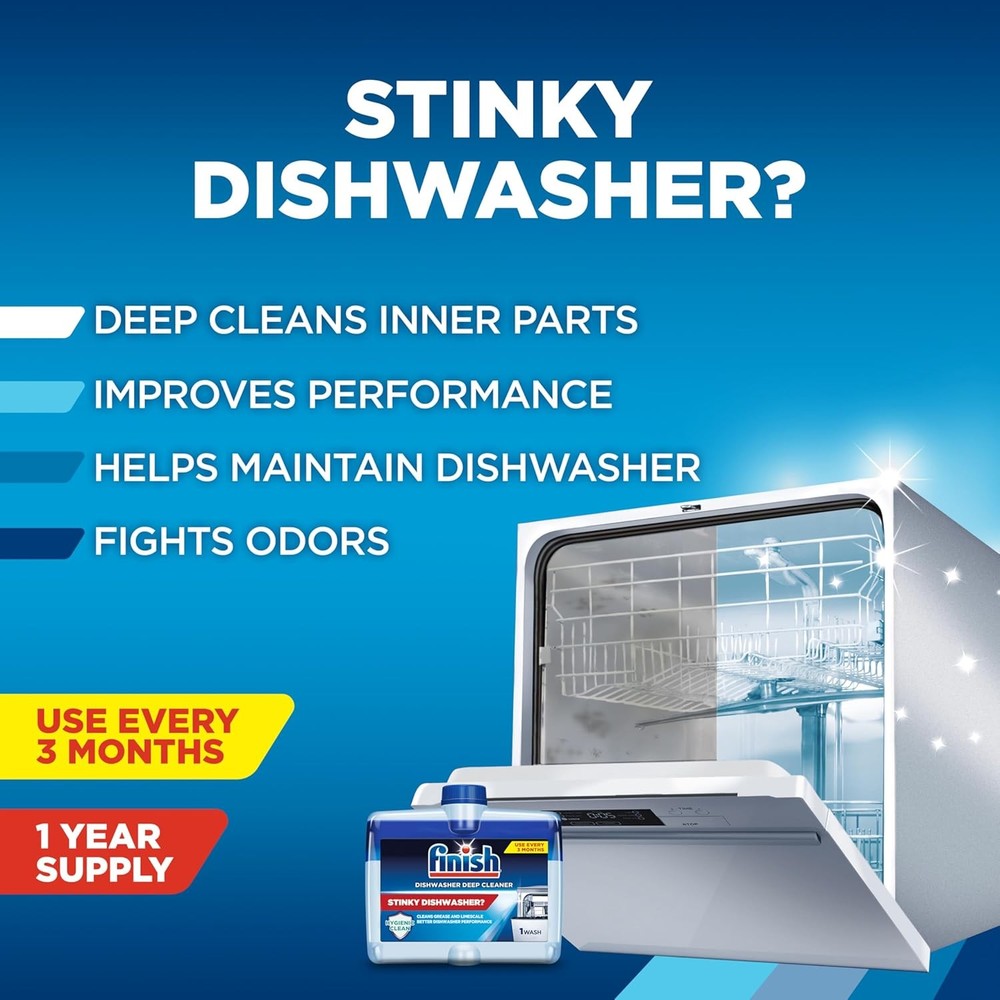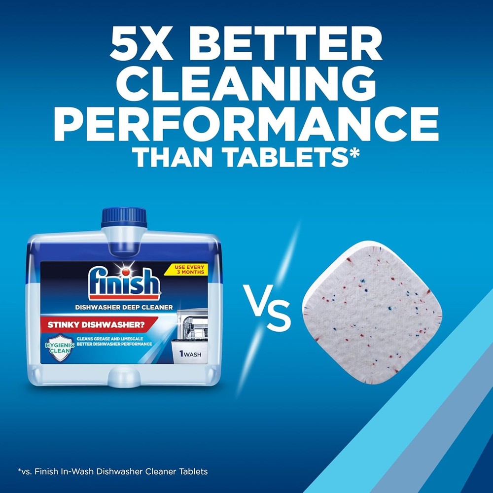 Finish Dishwasher Cleaner Liquid Deep Clean Grease Limescale Odor Control 4 Pack Brand Finish Item Form Liquid Scent Unscented Specific Uses For Product Dishwasher Material Feature Mineral Based, Unscented Features DEEP CLEANS INNER PARTS: Finish Liquid Dishwasher Cleaner targets hidden grease, hardwater buildups, and limescale in spray arms, filter, and pipes for a hygienic clean. IMPROVES DISHWASHER PERFORMANCE: Your dishwasher cleans dishware better with Finish dish washer machine cleaner. FIGHTS ODORS AT THE SOURCE: Neutralizes lingering smells and keeps your dishwasher fresh after each use. HELPS MAINTAIN DISHWASHER HEALTH: Use every 3 months to help keep your dishwasher clean and performing at its best. 5X MORE CLEANING PERFORMANCE: Finish dishwasher cleaners have 5X more cleaning performance than dishwasher cleaner tablets. COMPATIBLE WITH MOST DISHWASHERS: Works with standard, older, and small dishwashers for flexible, reliable use. EASY TO USE: Empty your dishwasher, remove sticker on the top, place the bottle upside down in the bottom rack and run a hot cycle. Let Finish does what its best at! FINISH YOUR CLEAN: Use Finish Machine Cleaner Liquid, Finish Jet Dry dishwasher rinse aid, Finish Ultimate dishwasher detergent pod for the optimal dishwashing experience. Shop today our dishwasher supplies, like Finish dishwasher pods and rinse aid. Disclaimer: *vs. dirty dishwasher. vs. Finish Dishwasher Cleaner Tablets Our Business 100% Customer Satisfaction We go above and beyond to ensure you receive the best level of service. Returns We want you to be happy with your purchase, however in the rare occasion that you are not, please let us know and we will contact you to arrange either a collection or a refund. Please CONTACT US before leaving any negative feedback and we will promptly sort out any issue with your order. 8100379