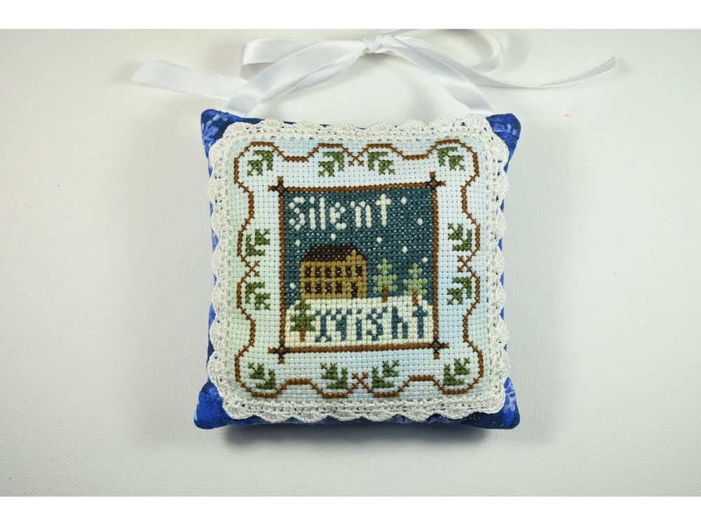 Little House Needleworks: "Silent Night" This design is finished into a Mini Pillow ornament topped with a ribbon bow hanger and backed with coordinated cotton fabric. The finished size is 4 1/2" x 4 1/2" Stitched on: 16 count Aida Fabric This was handmade in a smoke & pet free home. Payment is expected within 3 days of win of auction. I will gladly combine shipping if you are bidding on multiple. Please request a combined invoice before paying so I can do the adjustment. Thanks for looking