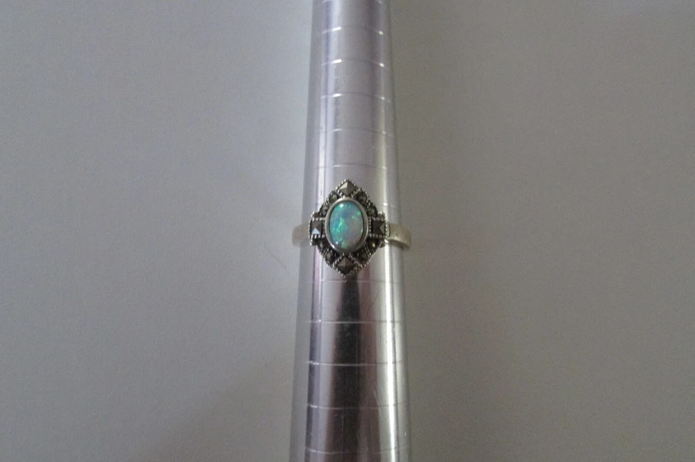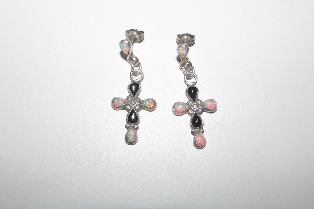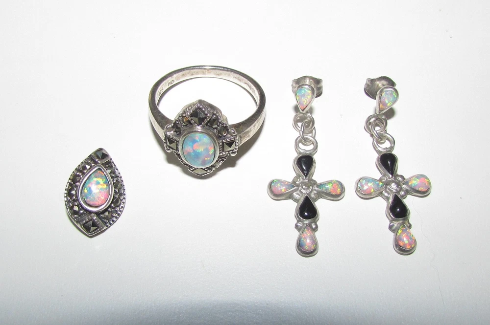 Fire opal, marcasite, and onyx with sterling silver jewelry set. Set includes a pair of cross earrings, a pendant (no chain included), and a ring. The ring is a size 8 and is stamped/signed "M 925" on the inside. The pendant is stamped/signed "M 925" on the back. The stud dangle earrings are both stamped "sterling" on the back. Stamps/signatures shown in pictures. Sold together, not separate. Buyer will receive items exactly as pictured. Shipping is United States (US) only. If outside US, contact me.