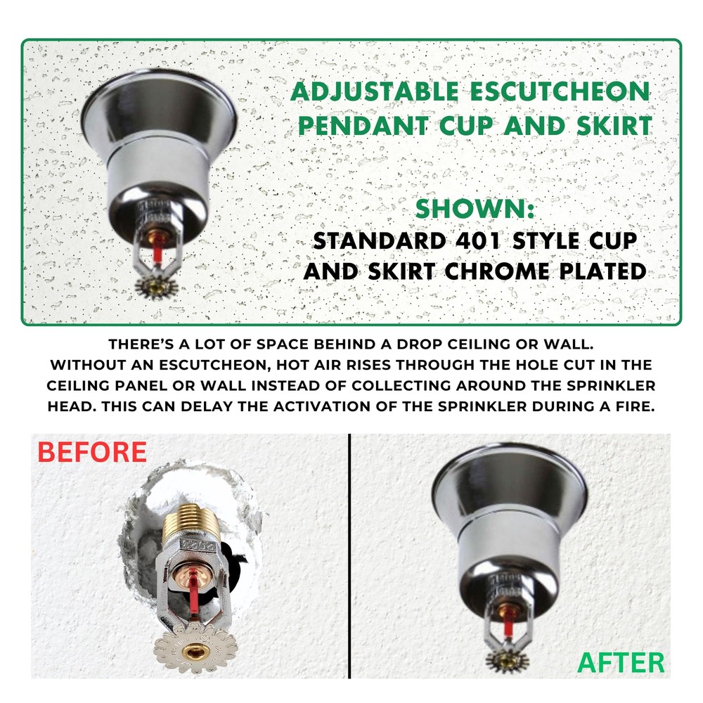 Fire Sprinkler Escutcheon Skirt, FLUSH Escutcheon Pendant Skirt Chrome Plated, Works with Standard 401 Style Cup, Short Cup, and Retrofit 2 Piece Cup, Fire Sprinkler Skirt Adaptable: Works with Short Cup allowing adjustments from 1/4 - 3/4 inches and Standard 401 Cup and Retrofit Cup allowing adjustments from 1/4 - 1-5/8 inches. Versatile Gap Filling: Our skirts expertly bridge the space between the escutcheon and the wall or ceiling. They also help with varying distances between the ceiling or wall and the branch lines. Sleek Appearance: Our Escutcheon Skirts provide a clean, polished look for your pendent and sidewall sprinklers, enhancing the aesthetics of your fire sprinkler system. Cover Unsightly Gaps: Skirt and Cup design fills annular space for secure placement and safety keeping heat and smoke from bypassing the fire sprinkler system causing unnecessary harm and damage. NFPA Code Compliance: Escutcheons are required by NFPA codes, enabling your fire sprinkler system to meet essential standards. Enhance the appearance and functionality of your fire sprinkler system with our Adjustable Escutcheons. Designed to accommodate variations in pipe-to-ceiling or wall distances, these essential devices ensure a seamless integration of your sprinkler heads while maintaining proper functionality. During installation, our adjustable escutcheons effortlessly cover the holes surrounding fire sprinkler heads, providing a polished finish and preventing debris from entering. Crafted to fit securely onto sprinkler frames, they can be easily installed after shutting off the water supply and, if needed, removing the sprinklers. Featuring a cup and skirt design, our escutcheons effectively fill the annular space between the sprinkler head and the hole's edge, keeping the sprinkler in place with the necessary clearance. Unlike standard flat metal rings, our adjustable escutcheons offer versatility, allowing you to fine-tune the position to accommodate various pipe cutting variances, depths, and angles as per your design requirements. For optimal performance and aesthetics, it's crucial to replace damaged, rusted, or discolored escutcheons promptly. Any painting should be done by the manufacturer to ensure proper functionality. Whether you're updating your space or maintaining compliance with NFPA codes, our fire sprinkler escutcheons are the ideal solution. Escutcheons are required by NFPA codes. Our escutcheons are made from Type 1010-1018 mild steel, ensuring durability and reliability. Available in 1/2 inch and 3/4 inch IPS sizes, these escutcheons help to ensure your fire sprinkler system meets essential safety requirements while enhancing the overall appearance of your space. Upgrade today for peace of mind and protection. Shipping We offer FREE shipping on all orders! We ship within Three business days of payment, usually sooner. We use a selection of shipping services such as UPS, FedEx, USPS etc. We only ship to the lower 48 states, no APO/FPO addresses or PO Boxes allowed. Local pickups and combined shipping options are not provided at this time. Return You can return a product for up to 30 days from the date you purchased it. Any product you return must be in the same condition you received it and in the original packaging. Please keep the receipt. Payment We accept payment by any of the following methods: PayPal Please pay as soon as possible after winning an auction, as that will allow us to post your item to you sooner! Feedback Customer satisfaction is very important to us. If you have any problem with your order, please contact us and we will do our best to make you satisfied. Contact Us If you have any queries, please contact us via ebay. We usually respond within 24 hours on weekdays. Please visit our eBay store to check out other items for sale! Thank you for shopping at our store.