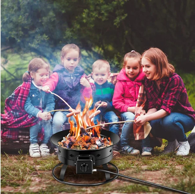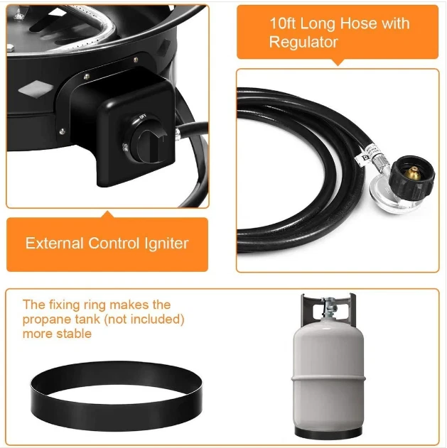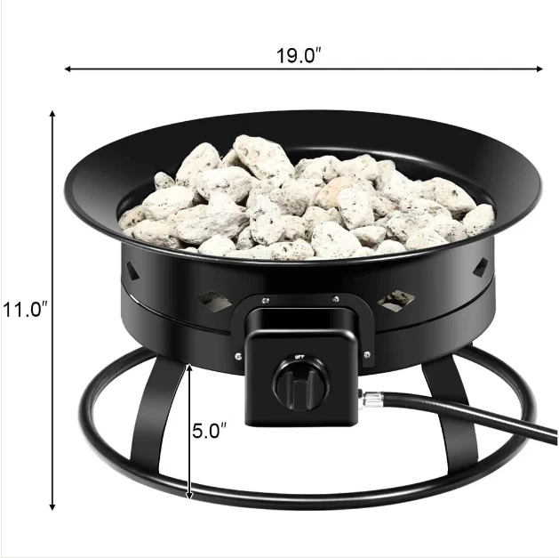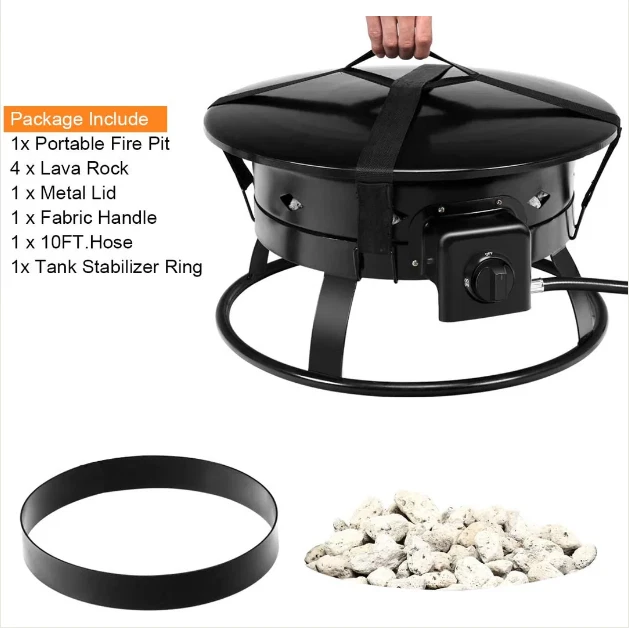 Firebowl Outdoor Portable Propane Gas Fire Pit Description Description: Our portable fire pit can bring you a more perfect outdoor camping experience! Our fire pit uses clean and environmentally friendly propane, which is safer to burn smokeless and odorless. Strong iron with black powder coating is rustproof and smooth for easy clean. The compact and portable design is easy to carry and store. It is your necessary partner for campfire parties, RV travels, family gatherings, and forest adventures. Features: Environmentally friendly propane fuel for safe use Burns without smoke, sparks and choking odors Sturdy iron construction with black powder coating for years of use Compact shape design to store easily Lava rock stones to bring you more beautiful flames of good heat Metal lid with fabric handle for easy carrying Including 10 ft hose with attached regulator Comes with tank stabilizer ring Round iron base to ensure stability Certified by CSA to allow use during most campfire bans Easy to assemble and maintain For outdoor use only, perfect for camping, backyards, terraces, beaches or caravan parks Specifications: Color: Black Product Dimensions: 19" x 19" x 11"(L x W x H) Material: Iron with Powder Coating Heat Output: 58,000BTU Net Weight: 19.5 lbs Package includes: 1 x Portable Fire Pit 4 x Lava Rock Stone 1 x Metal Lid 1 x Fabric Handle 1 x 10ft.Hose 1 x Tank Stabilizer Ring 1 x User Guide