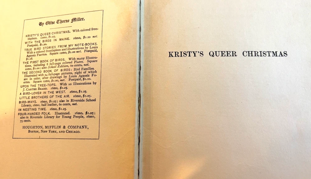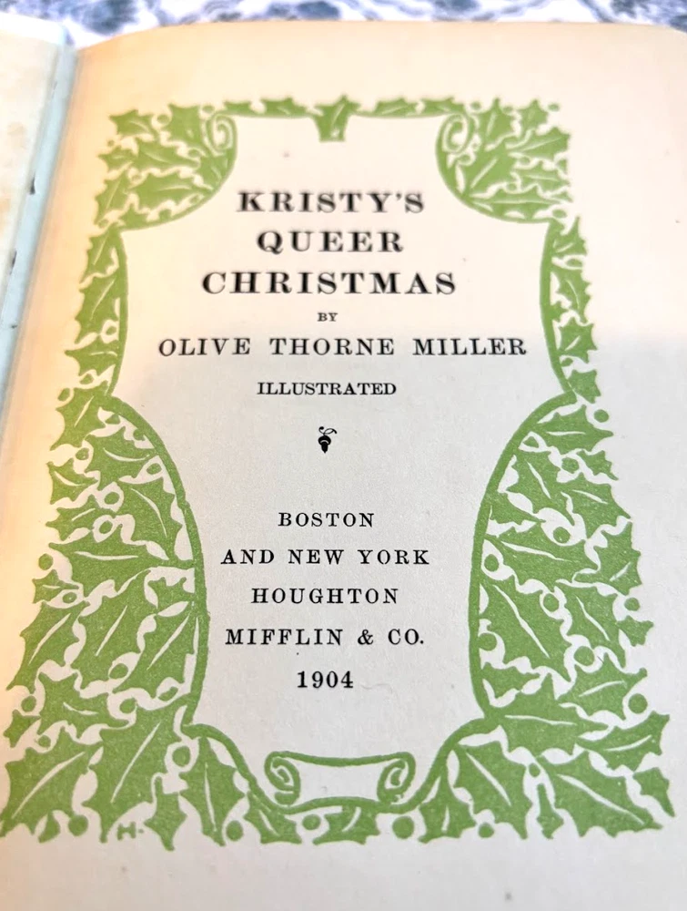 This rare first edition of "Kristy's Queer Christmas" by Olive Thorne Miller is a delightful addition to any book collection. Published by Houghton Mifflin & Co in 1904, this book is a valuable antiquarian and collectible item that is sure to impress.It was electrotyped by The Riverside Press in Cambridge, MA. The story revolves around Kristy and her unusual Christmas tree, which adds a touch of queerness to the festive occasion. The book is filled with captivating characters, making it a wonderful choice for those who enjoy collecting rare editions of classic children's books. Don't miss out on the opportunity to own this unique piece of literature. There is a gorgeous frontispiece (see photo). The book is 120 years old, but in decent shape with some signs of wear. This would be a treasure for a collector of Christmas books or of Olive Thorne Miller.