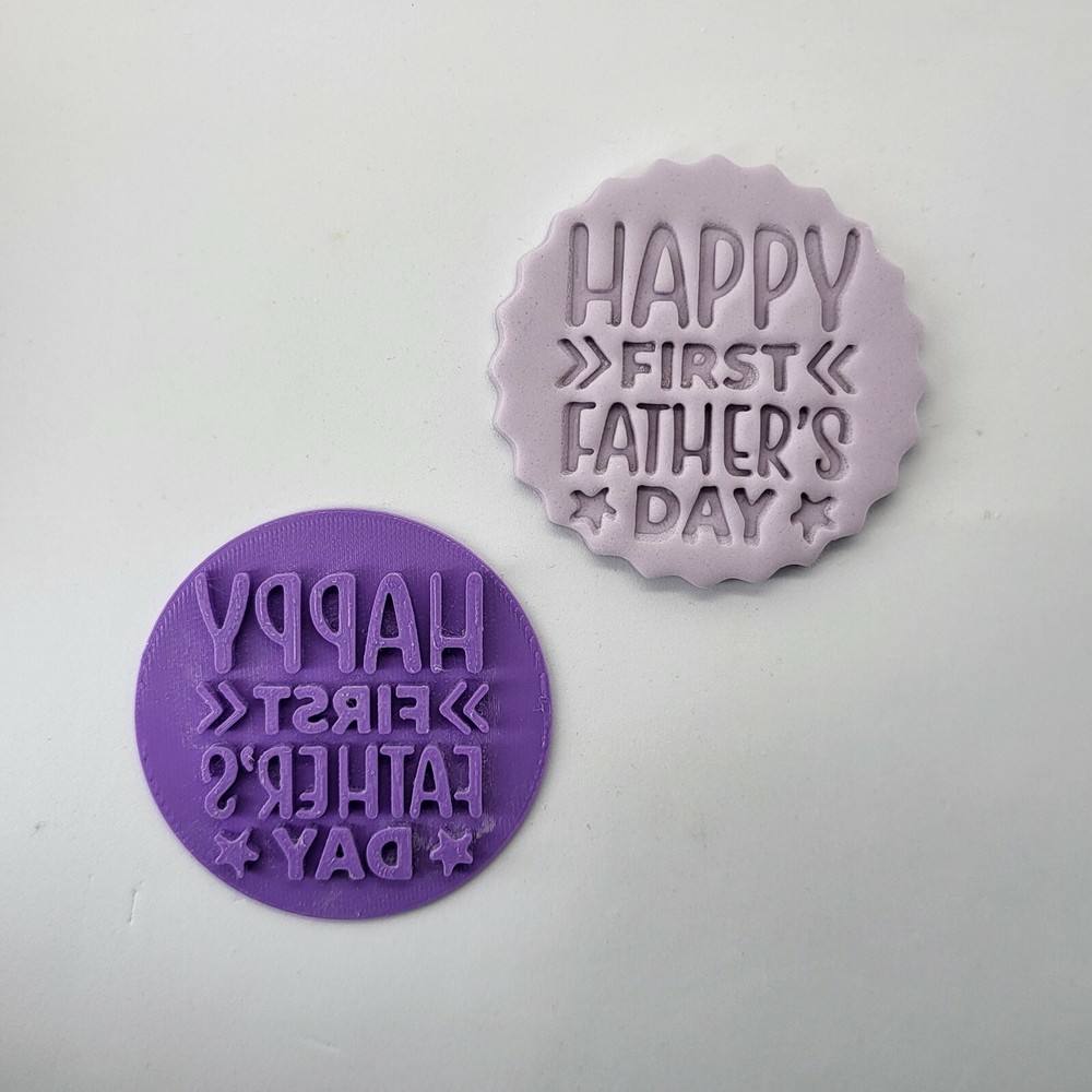 First Father's Day Fondant Stamp Trusted, reliable company. Either present us with a design or we will happily design the stamp for you. Usually sent out next working day once you are happy with the stamp! The 3D Printed Fondant stamp is 6cm x 6cm posted 1st Class Royal Mail (UK) and Standard International (ROW). WE CAN CHANGE THE SIZE TO SUIT YOUR REQUIREMENTS We can create almost ANY design for you As these are 3d printed, there may be small imperfections but only stamps we are 100% happy with will be sent out - satisfaction guaranteed or your money back Care instructions Use icing sugar or flour to stop the dough sticking to the embosser. Hand wash with lukewarm water. *They are made using PLA which is a completely biodegradable material that has been produced with 100% renewable natural resources.