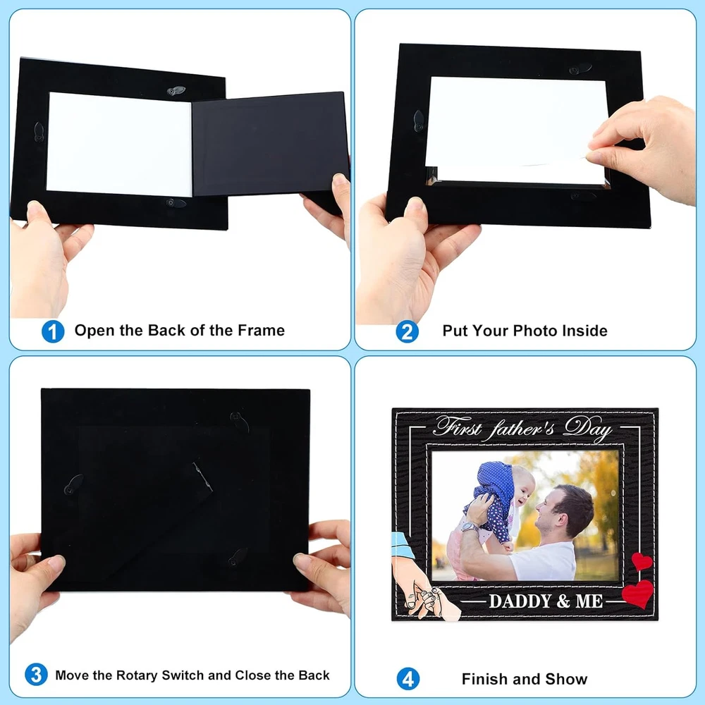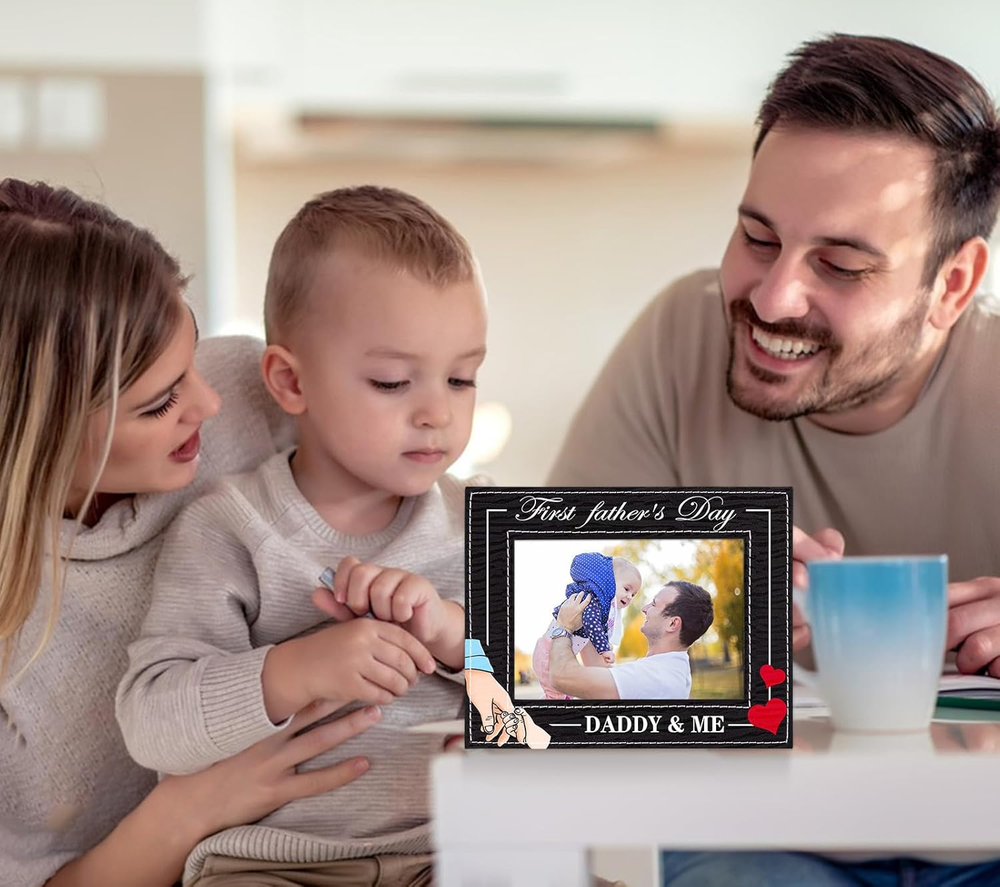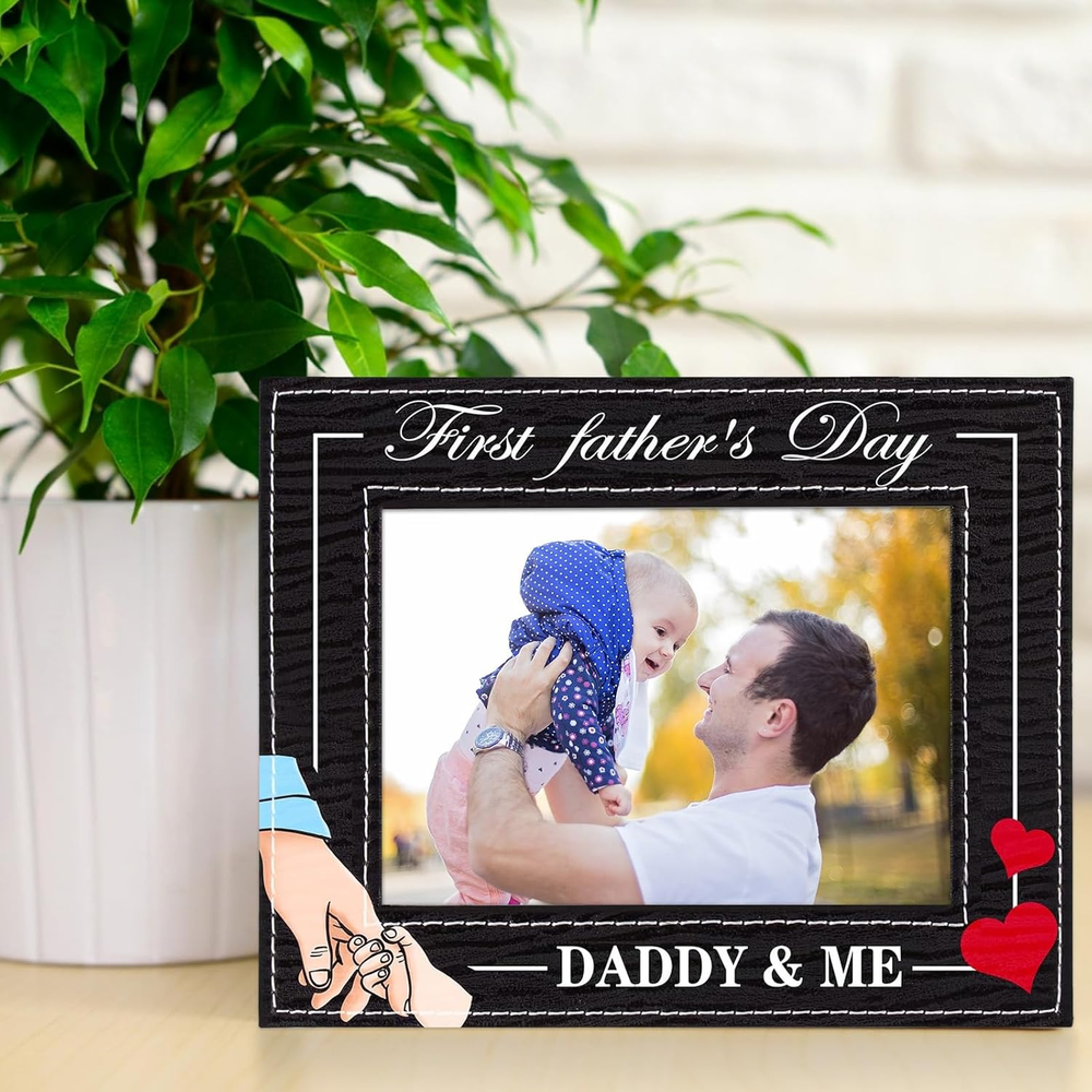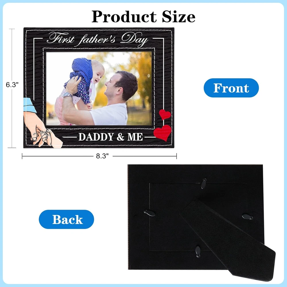 【Dad To Be Gifts for 1st Time Dad】: The 1st Fathers day frame from baby boy girl features a heart and father is holding the chirld's hand,and the daddy and me picture frame is printed with "first father's day daddy & me"that meaning the little kids forever need the father's love and company. Encased in a sturdy kraft paper box, designed to safeguard your frame during transit while delivering a friendly unboxing experience. 【Proper Size】: 1st fathers day frame size is 6.3x8.3 inches, insert photo about 4x6 inches. Celebrate the special bond between father and child. From the exquisite printing to the heartfelt message, this photo frame perfectly captures the essence of Dad's first Father's Day, providing cherish memories for first father's day. Great first fathers day gift from son daughter new born baby girl baby boy. This is a lasting and memorable Fathers day gift for expecting dad father to be. 【High-quality Material】: The new dad photo frame is made of MDF board with pu leather cover, sturdy and anti-fading,vintage classic design,durable and reusable,can be used for a long time. Provides a elegant design that complements any home nursery decor. Great nursery decor baby's room decor baby shower decorations. 【Easy to Use】: The 1st Father's day frame keepsake has a folding easel on the back, easy to put on table or desk. With Rotating Buttons, the best dad ever gift photo frame is easy for photo installation and change photos anytime. Whether it's for first time dad, dad to be, expecting dad, father to be daddy expectant dad, soon to be dad, the first Father's Day gift is sure to bring them joy and touch them. 【Showcase Precious Memories】:Makes a great gift for any occasions,such as: fathers day gifts for first time dad,daddy first fathers day gift from wife,new parents gift, new baby boy girl gift, newborn gift, new father gifts, new dad gift,daddy to be gift,first time daddy gifts,first fathers day frame from baby daughter or son. It also can be used for baby shower, birthday gift. Product Description