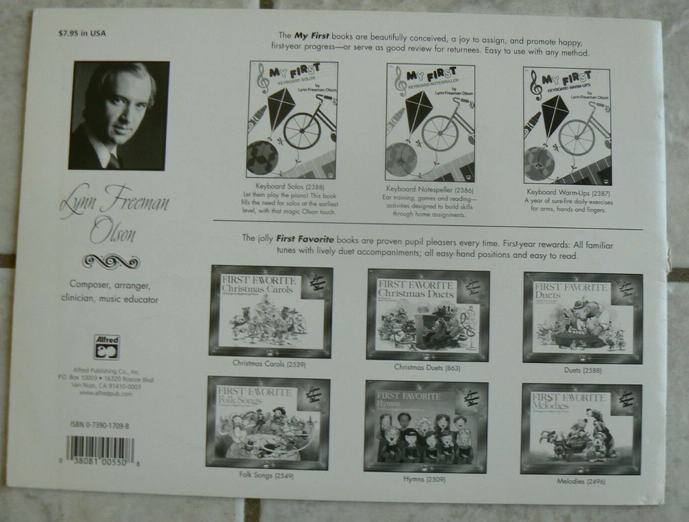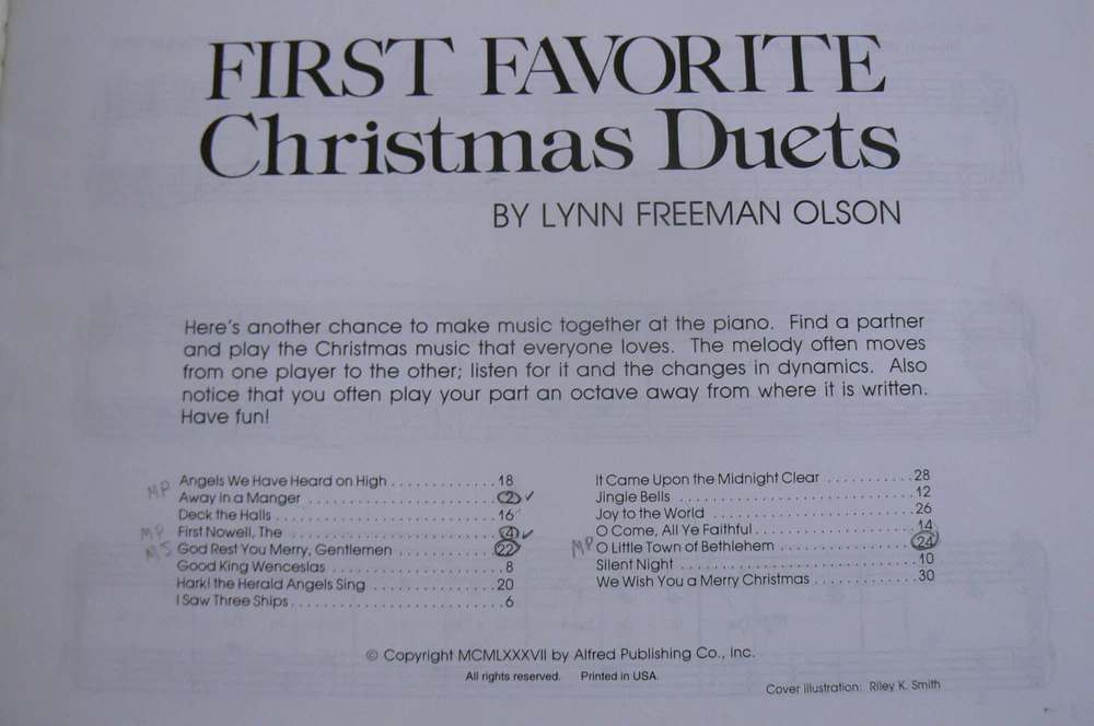 This listing is for a 1987 piano book titled First Favorite CHRISTMAS DUETS 15 Carols for Beginning Pianists Arranged by Lynn Freeman Olson " Find a partner and play the Christmas music that everyone loves. These fun and simple Christmas duets are enjoyable for both players since the melody moves from one part to another. " This 31-page softcover book is in very good condition with all pages crisp and sturdily bound; four of the pages have some notations on them. Please see the picture of the table of contents for the songs included here. You won't be disappointed! ~~~~~~~~~~~~ I'm listing MANY more books and other items. I'm happy to combine shipping. ~~~~~~~~~~~~~~~~~~~~~~~~~~~~ I normally mail ON the day I receive payment if it's received before 3 p.m. central time, and the next day if it's later than 3. Please take a look at my other listings; I'm listing many school books (and other items) and am happy to combine shipping! Items from smoke-free, pet-free home. Thanks so much for your time! Before leaving your feedback, if for any reason you feel I did not deserve or earn 5 stars in each category, please let me have the opportunity to make it right. I want every transaction to be 5-star worthy! Thanks so much! :)