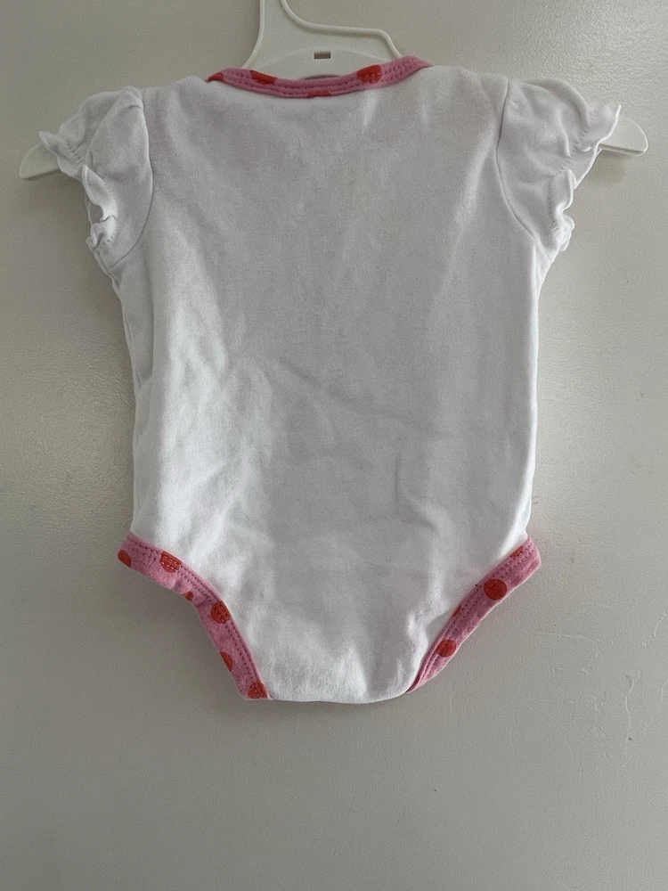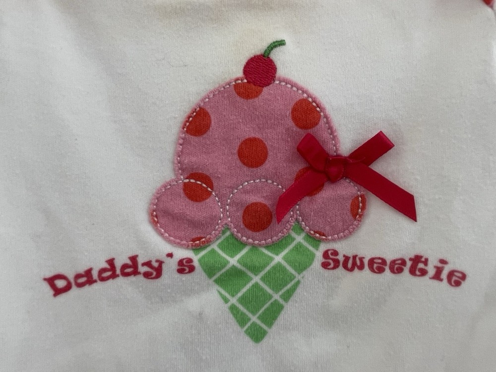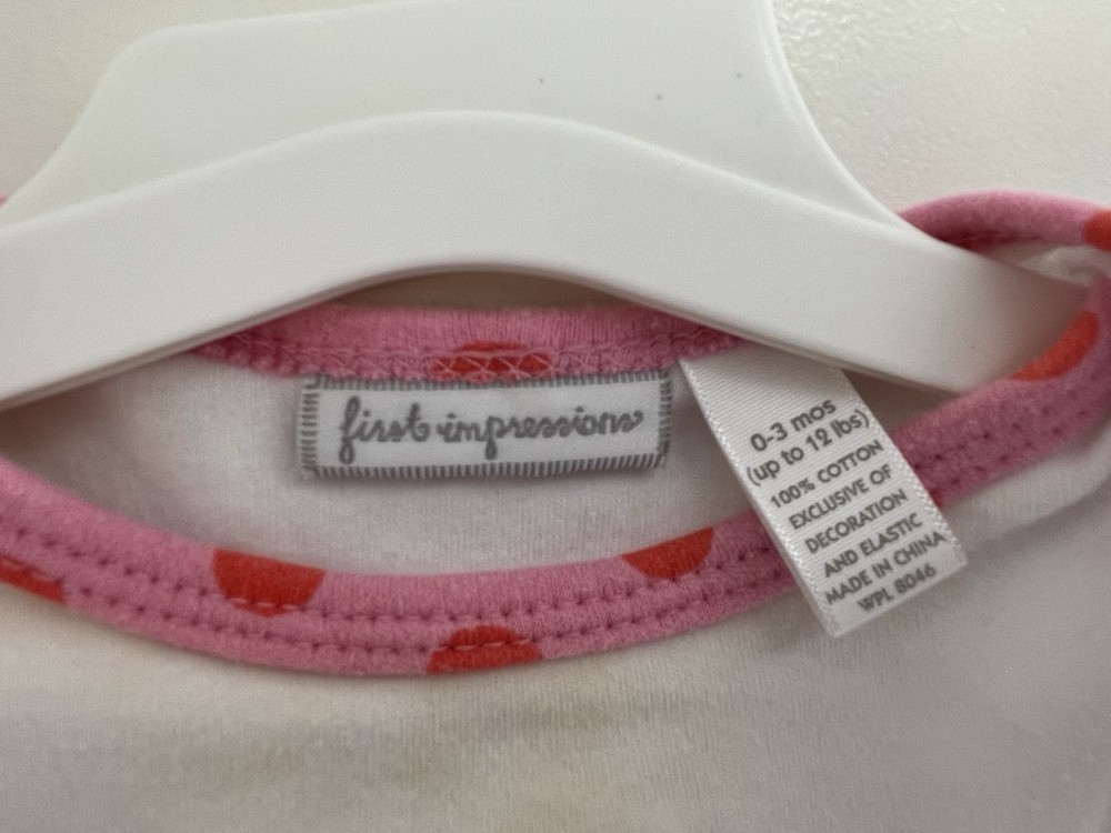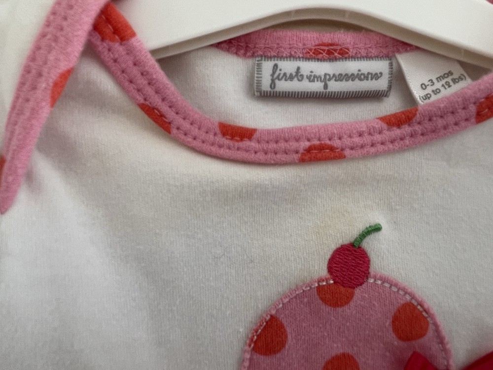 Size: 0-3 Months Sleeve Length: Short Sleeve Department: Girls Style: Bodysuit Neckline: Crew Neck Brand: First Impressions Garment Care: Machine Washable Accents: Bow, Embroidered, Pleated Closure: Snap Material: 100% Cotton Color: White Season: Fall, Spring, Summer Number of Pieces: 1 Piece Occasion: Casual Country of Origin: China Set Includes: Bodysuit Type: One-Piece Theme: Food & Drink, Ice Cream Pattern: Graphic Print Features: Comfort, Easy Care, Lightweight, Stretch Seller Notes: “In very good condition. Free of rips or stains.”