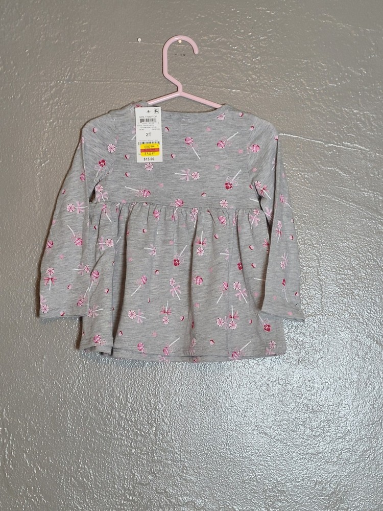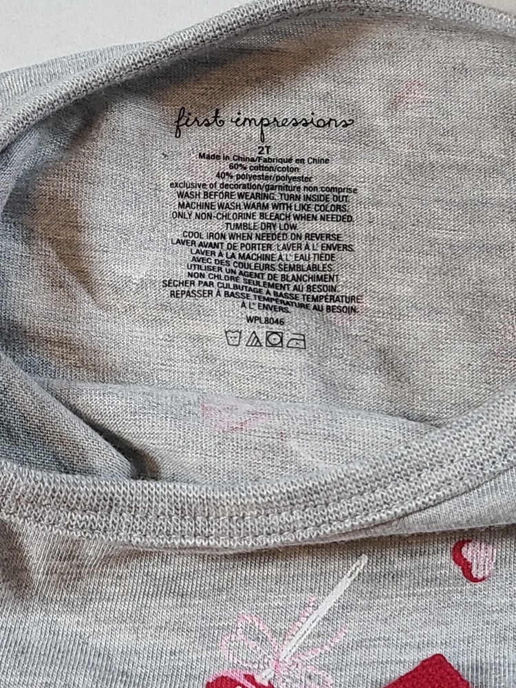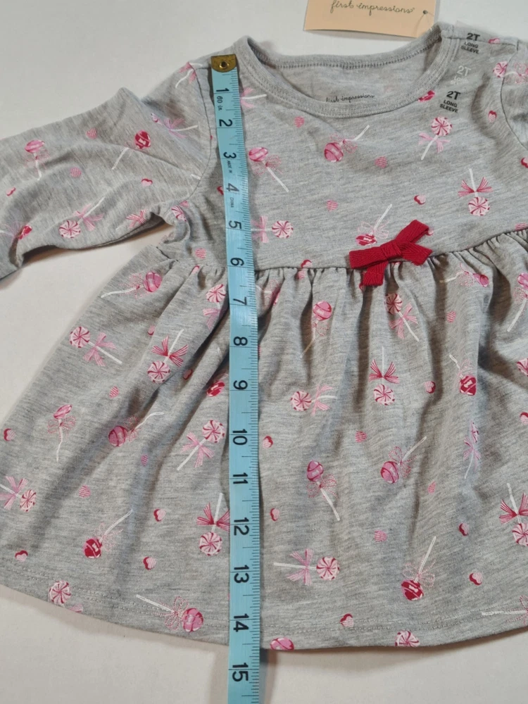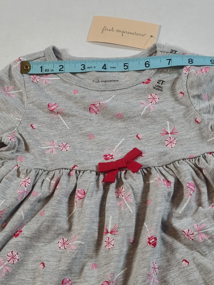 Closure: Pullover Fit: Regular Type: T-Shirt Handmade: No Vintage: No Features: All Seasons, Easy Care, Lightweight Style: Pullover Personalize: No Garment Care: Machine Washable Size: 2T Accents: Bow Character: Lollipops Pattern: Graphic Print Season: Fall, Spring, Summer, Winter Color: Pink Fabric Type: Blended Fabric Sleeve Length: Long Sleeve Country of Origin: China Neckline: Round Neck Department: Girls Occasion: Casual, Travel Material: 60% cotton and 40% polyester Brand: First Impressions