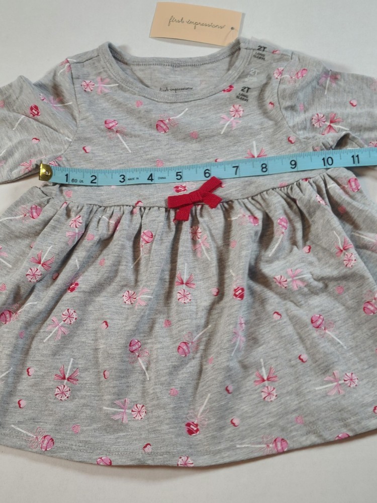 The First Impressions NWT Cute And Adorable Lollipop Shirt in size 2T is a pink long sleeve t-shirt featuring a graphic print of lollipops. It has a round neckline and pullover closure, making it suitable for casual and travel occasions. The shirt is made of a blended fabric of 60% cotton and 40% polyester, making it lightweight and easy to care for. With a cute bow accent, this adorable shirt is perfect for all seasons and is machine washable for added convenience. See photos for measurements approximate. NWT
