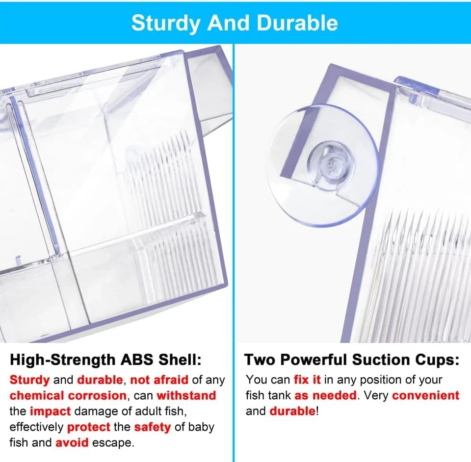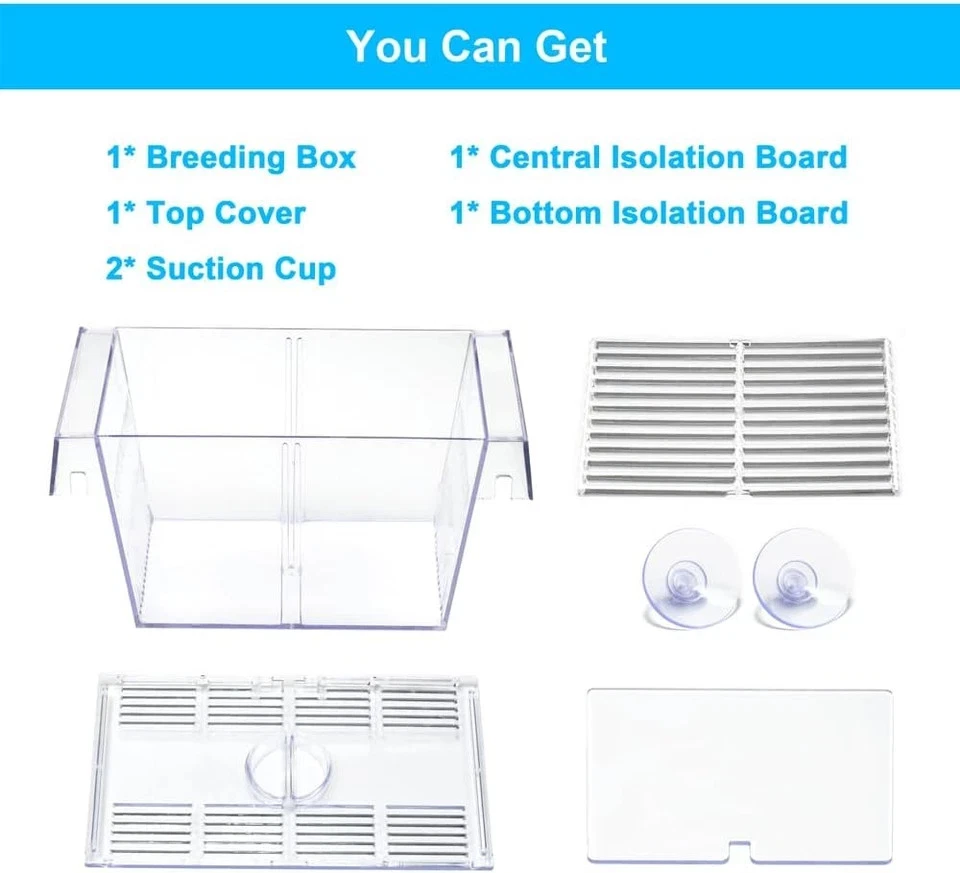 About this item 【DaToo Fish Breeding Box】: How to protect pregnant fish and newborn fish? Don't worry, DaToo fish breeding box will give you the answer. Perfect breeding box, safe and comfortable isolation space, sturdy and durable, crystal-clear viewing, easily creat a safe and reliable nursery center for your fish! 【Perfect Breeding Tank】: Separating adult fish from fry or juveniles is an effective way to ensure their survival. The DaToo fish breeding box is divided into upper and lower layers. When the female fish give birth, the fry will automatically fall to the lower layer, which can prevent the newborn fish from being eaten and improve their survival rate. This is a perfect hatchery for betta, guppy, medaka and other viviparous fish! 【Safe And Comfortable Isolation Space】: Sometimes pet fish need our special care. If we find pregnant, injured or aggressive fish, we need to put them in a separate space to keep them safe and calm. DaToo breeding box can provide a safe and comfortable space for your fish. The 2MM isolation gap ensures that the warm oxygenated water in the main aquarium can flow freely through the breeding box, so your fish enjoy the same conditions as the aquarium. Very Comfortable! 【Sturdy And Durable】: High-strength ABS shell, sturdy and durable, not afraid of any chemical corrosion, can withstand the impact damage of adult fish, effectively protect the safety of baby fish and avoid escape. Two powerful suction cups, can fix the DaToo breeding box in any position of your fish tank as needed. Very convenient and durable! 【Crystal-Clear Viewing And One Year Warranty】: DaToo has a crystal-clear acrylic surface, allowing you and your children can clearly see how the female fish give birth. This is very interesting and educational. It can help your children understand the wonders of nature and let your children know the world. We provide one year warranty and 24 hours professional customer service. Buy With Confidence!