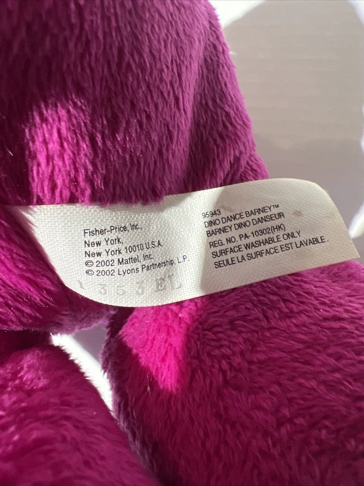 gtin13:Does not applySize:Medium (14-24 in)Age Level:3-4 Years, 4-7, 8-11 Years, 12-16 Years, 17 Years & UpYear:2002Character Family:Barney & FriendsCountry/Region of Manufacture:ChinaBrand:Fisher-PriceRecommended Age Range:3+MPN:N/AUPC:Does not apply