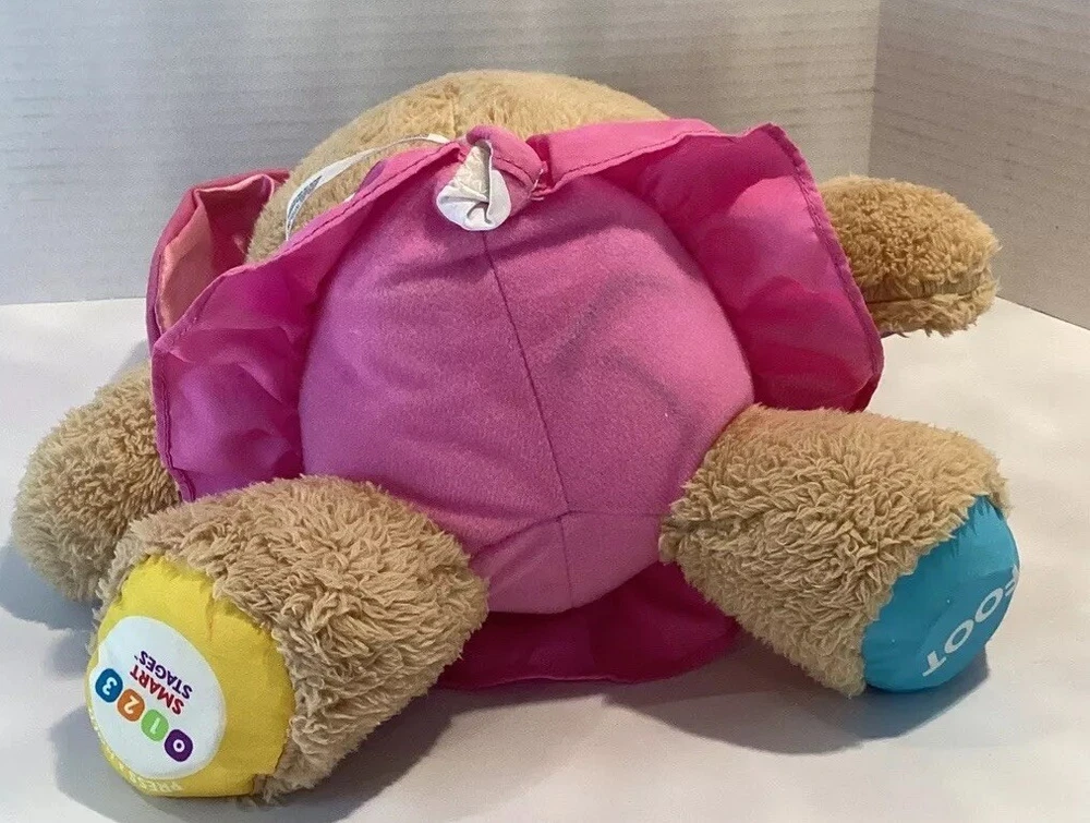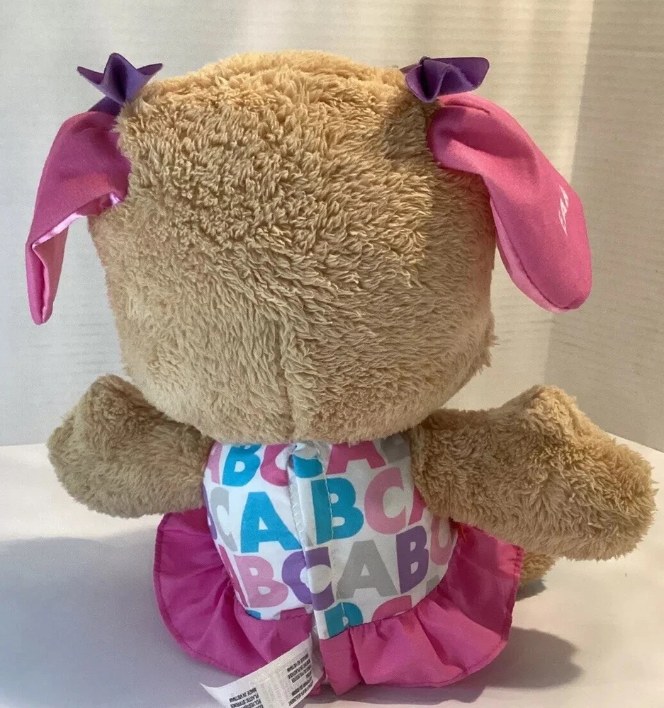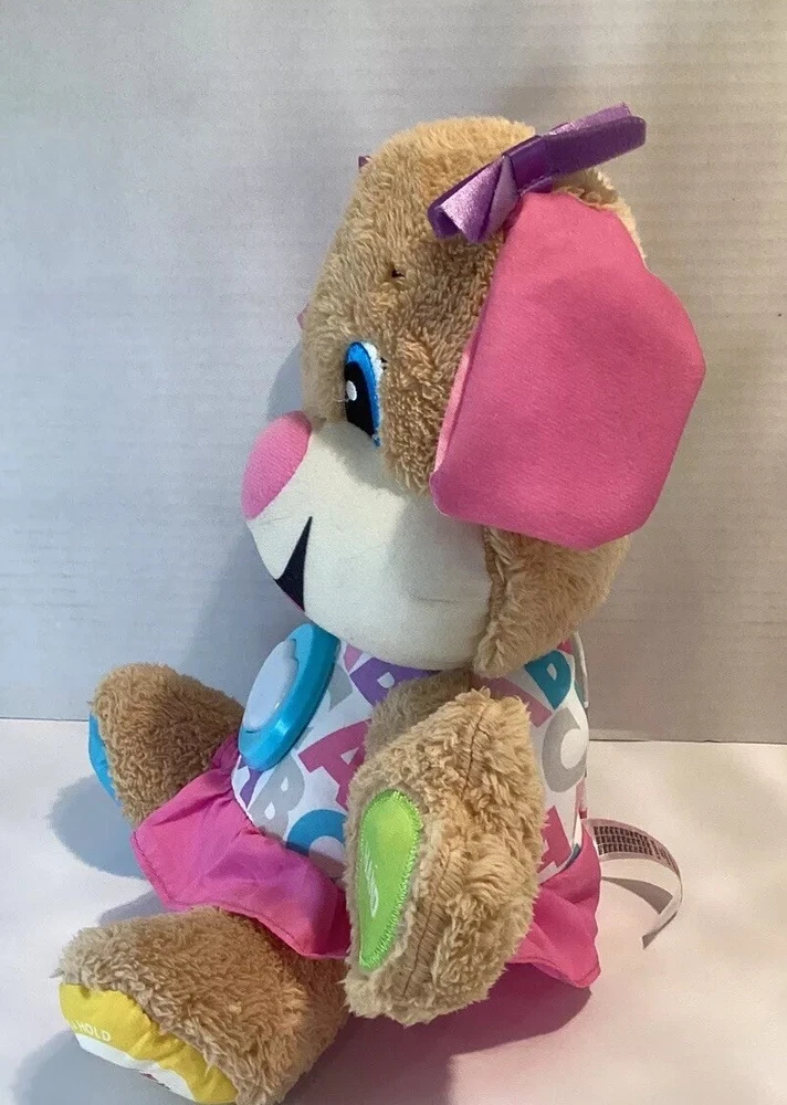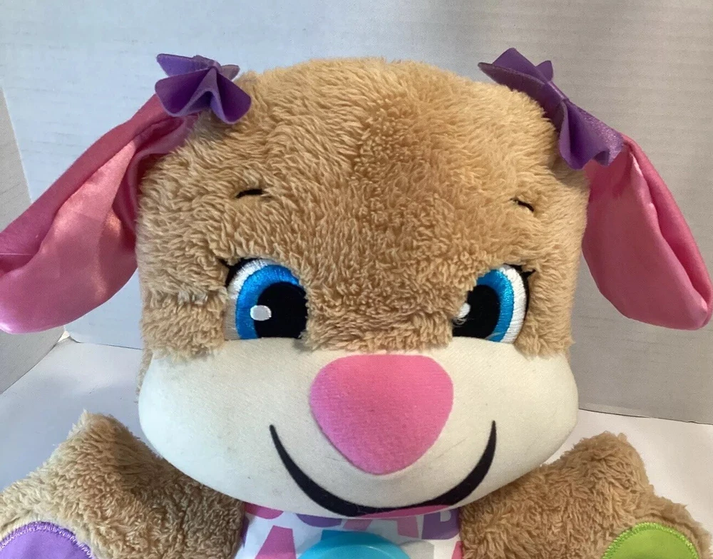 Fisher Price Little Sis Puppy Dog Laugh And Learn Smart Stages FDF22 is a used learning toy designed for girls aged 18-24 months. It is a pink-colored Fisher-Price model with the Laugh and Learn theme and the character family of Fisher Price. The toy helps develop hand-eye coordination, language, and memory skills. It has smart stages technology and is made in China.
