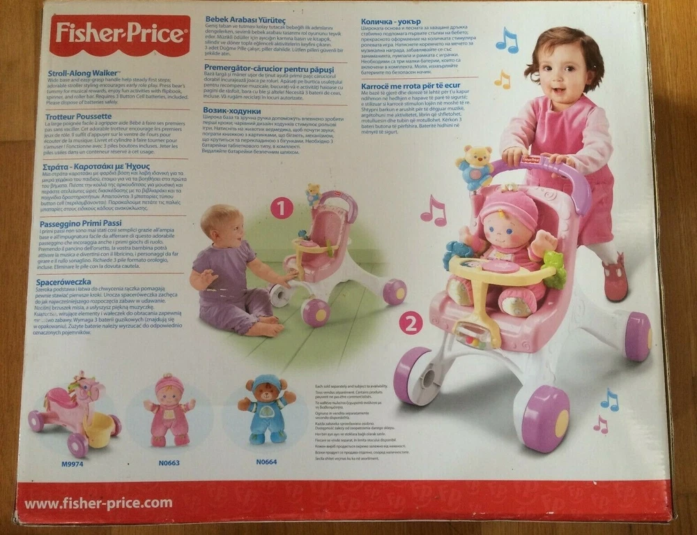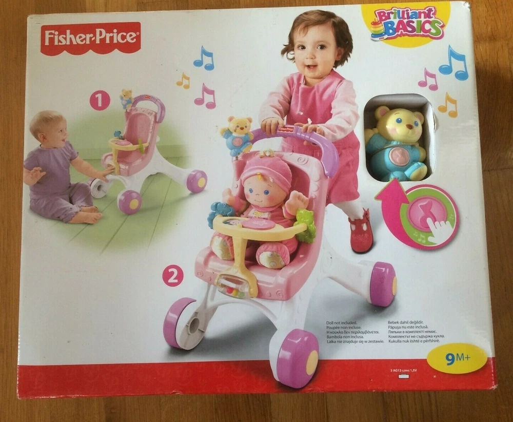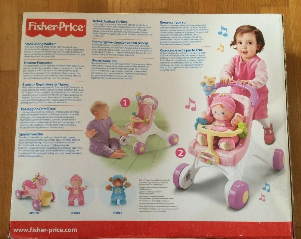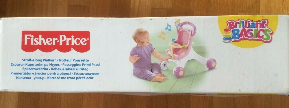 Fisher Price STROLL-ALONG WALKER 2010 version . Brand new in sealed box. Condition is New. Any questions please free to ask. When your baby is ready for the new world of walking, Stroll-Along Walker is ready to lend steady support! the wide, stable base and easy-grasp handle help steady first steps, and sweet music plays as baby strolls along. Its a great way to encourage early role play and gross motor skill development--and its loaded with fun sit & play activities, too. Press the wiggly bears belly for musical rewards; enjoy hands-on fun with spinners, a roller bar and flipbook! Theres even room to take a friend along for a stroll! (Doll not included.) Fisher-Price Brilliant Basics Stroll-Along Walker: Age Range: 9M+ Sturdy pretend stroller steadies babys first steps Music plays as baby walks along, or when baby presses the wiggly bears belly Hands-on activities include spinners, roller bar and flipbook Adorable stroller styling encourages early role play and nurturing Includes 3 button cell batteries