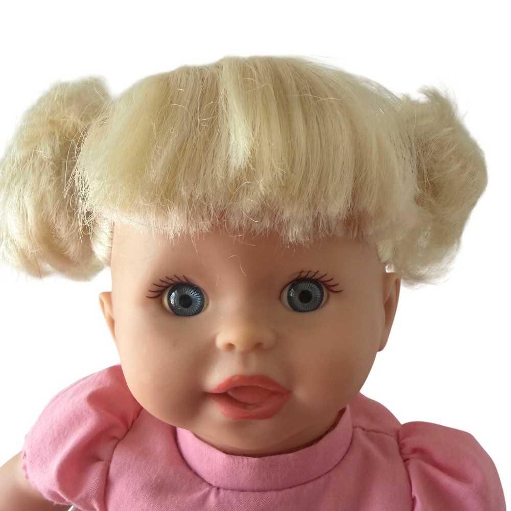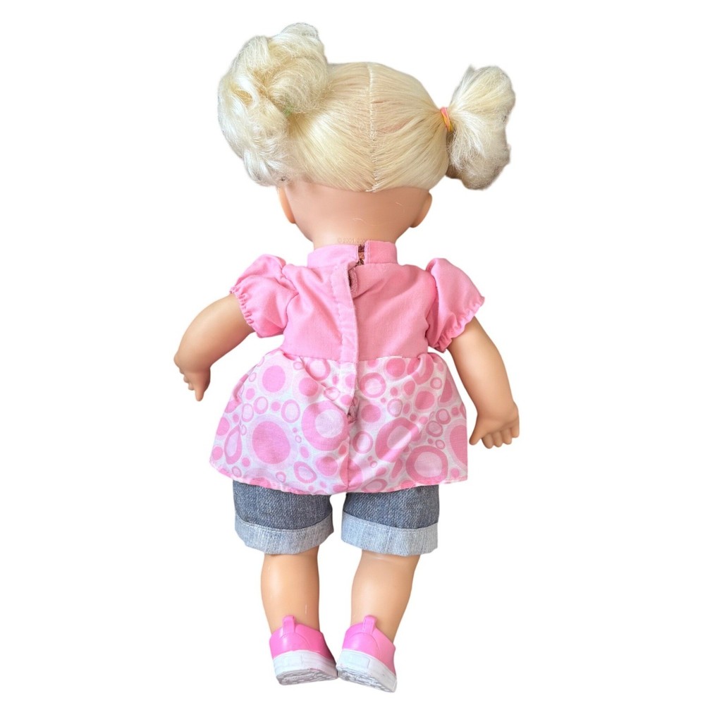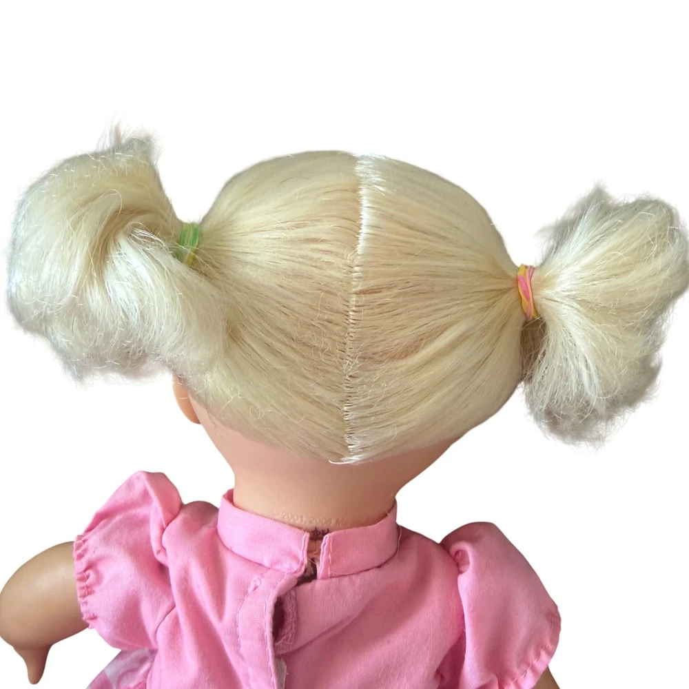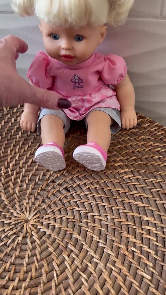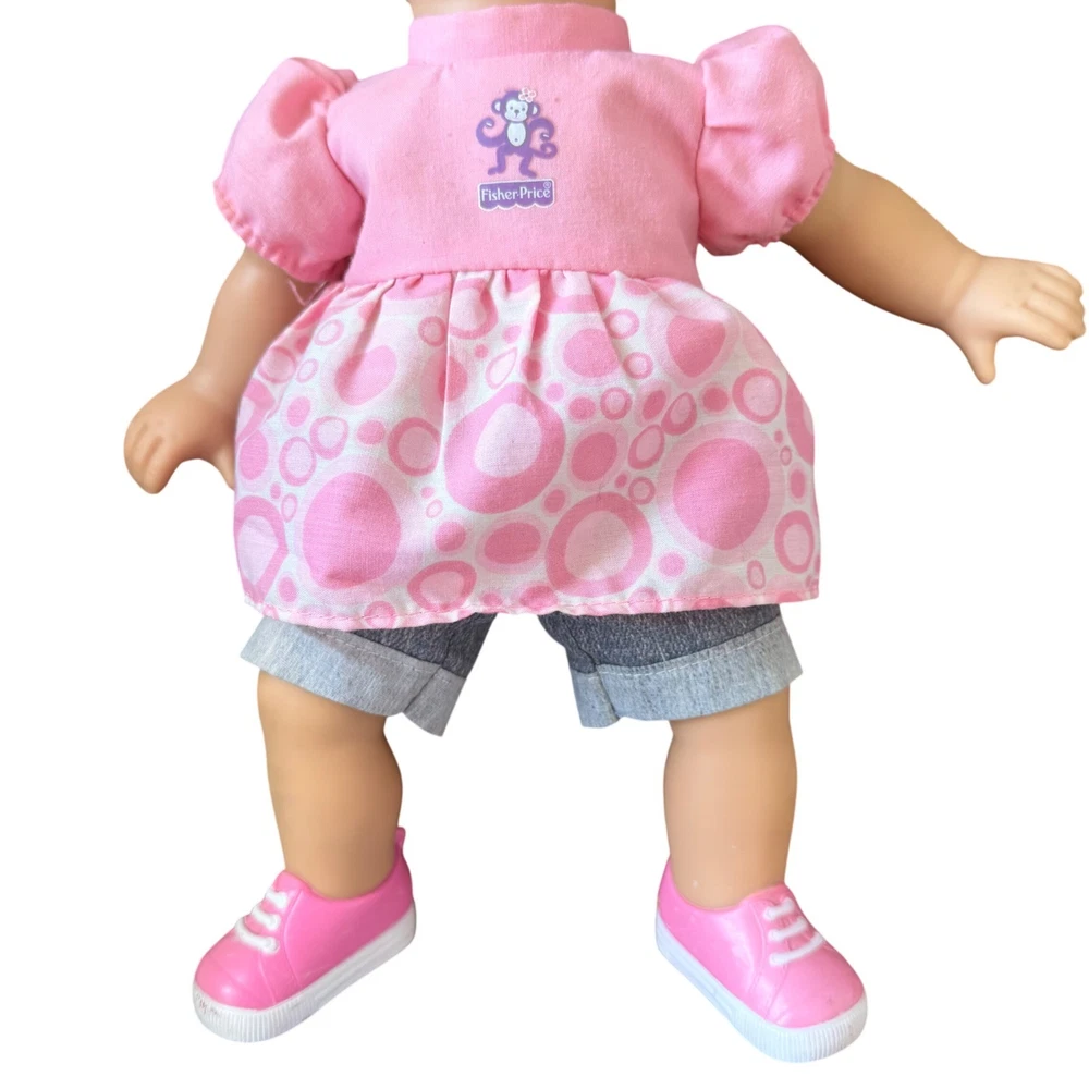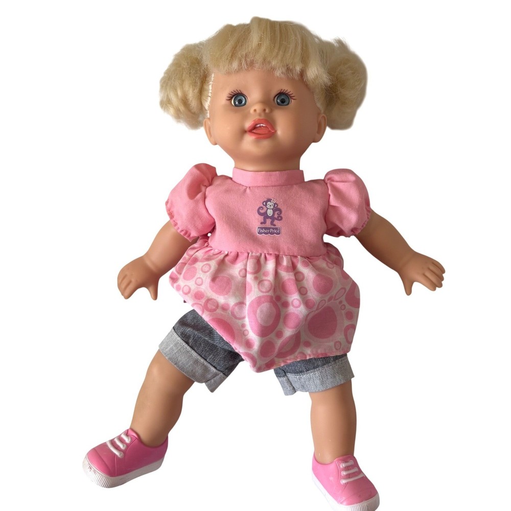 Fisher-Price Little Mommy doll features blonde hair styled in pigtails and blue eyes. She comes dressed in a pink monkey graphic top with a patterned skirt overlay and denim-style shorts. Completing her outfit are matching pink and white sneakers. This doll has a soft body with vinyl limbs and head, perfect for nurturing play. The back of the neck is marked with Mattel 2001, 2008. She works perfectly and is in incredible shape for her age. No flaws on skin, light chipping on shoes. Hair is in great shape. See video! Our items are curated with care, enjoy!