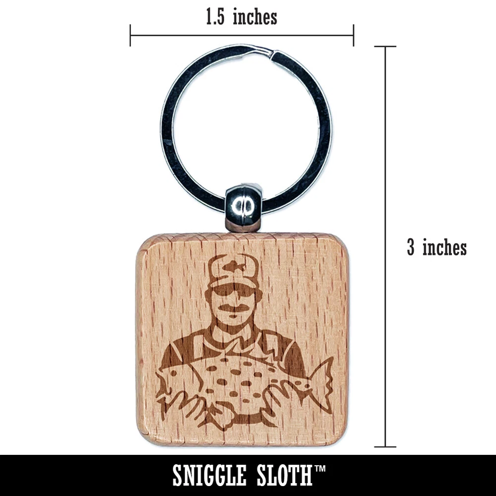 Fisherman Holding Fish Catch Engraved Wood Square Keychain Tag Charm