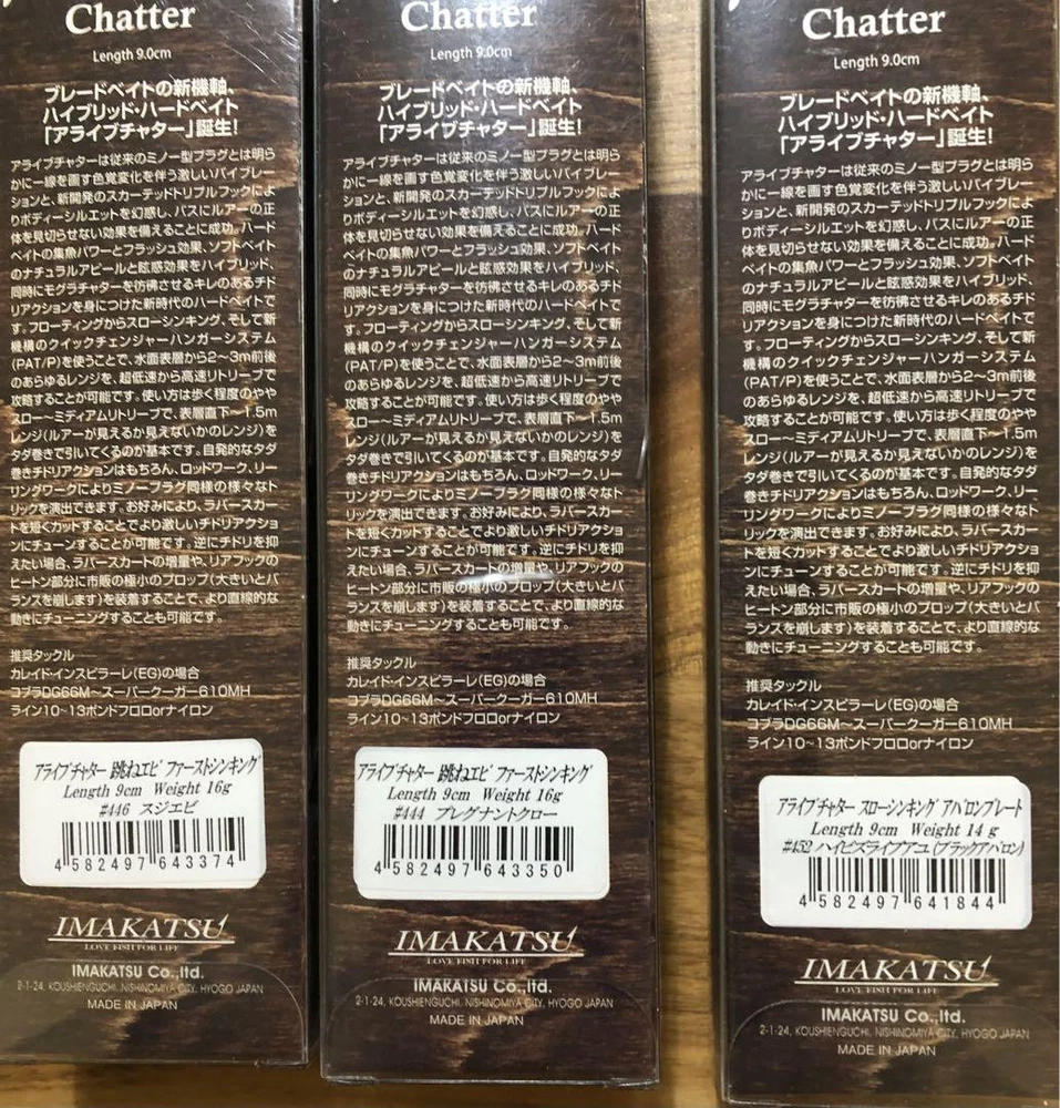 Item Title Fishing Lure Imakatsu Alive Chatter Slow Thinking 1Pcs First 2Pcs Payment Supports managed payments Please pay within 5 days after auction is finished. About Us We are located in Japan. It's our pleasure to make you happy by proposing our recommend item. If you have any questions or request about items, please feel free to ask us. International Buyers - Please Note: -Import duties, taxes, and charges are not included in the item price or shipping charges. These charges are the buyer's responsibility. -Please check with your country's customs office to determine what these additional costs will be prior to bidding/buying. -These charges are normally collected by the delivering freight (shipping) company or when you pick the item up - do not confuse them for additional shipping charges. -We do not mark merchandise values below value or mark items as - gifts - The US and International government regulations prohibit such behavior. Thank you for your understanding.