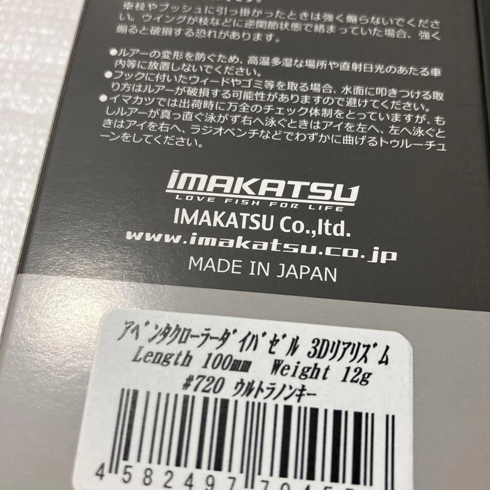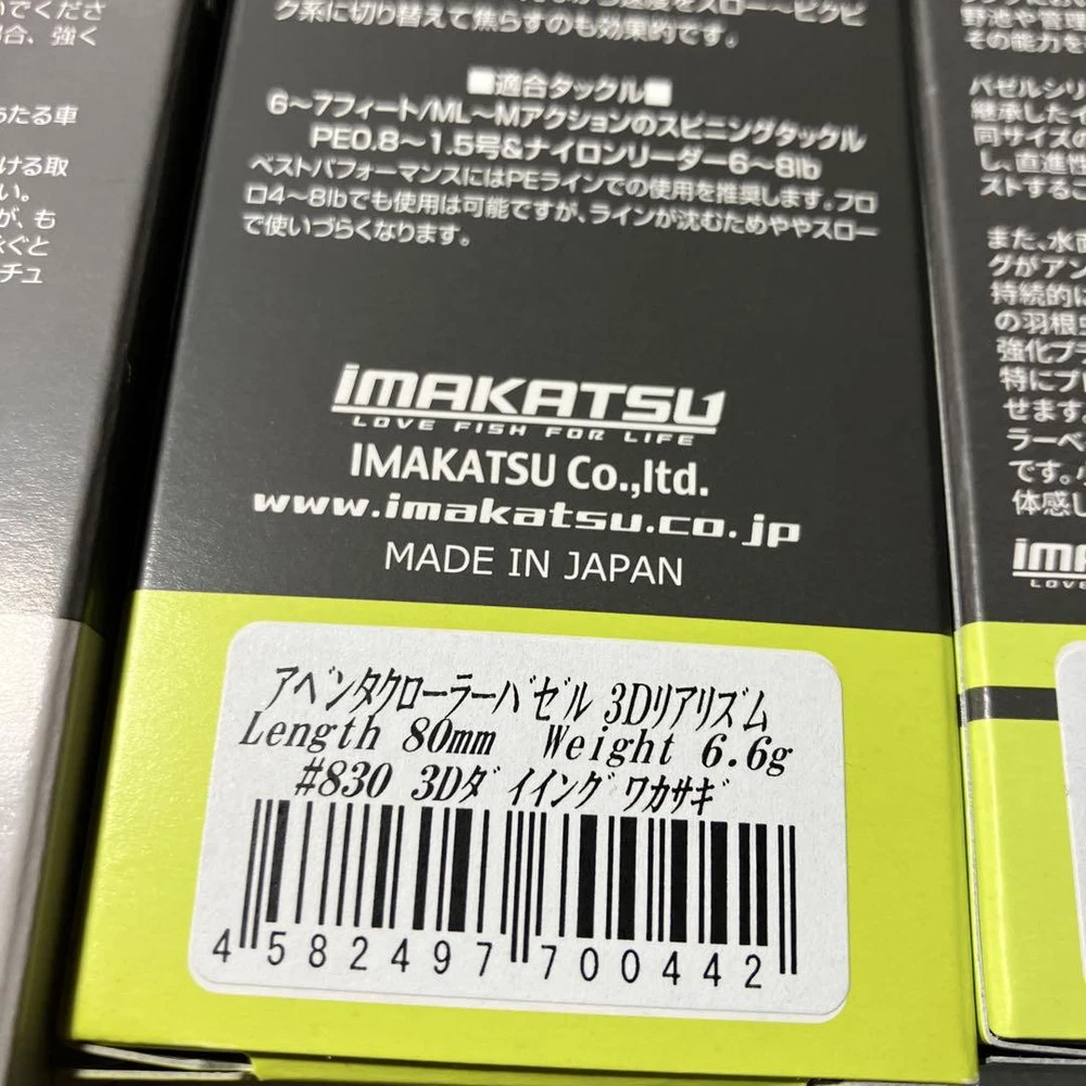 Item Weight: NA Country: Japan Color: NA Number in Pack: NA Features: NA Material: NA Buoyancy: NA gtin13: NA Fishing Type: NA Item Length: NA Bait Type: NA Brand: Imakatsu / Imae Katsutaka MPN: NA Fish Species: NA Bait Shape: NA Model: NA UPC: NA Maximum Diving Depth: NA Country/Region of Manufacture: NA