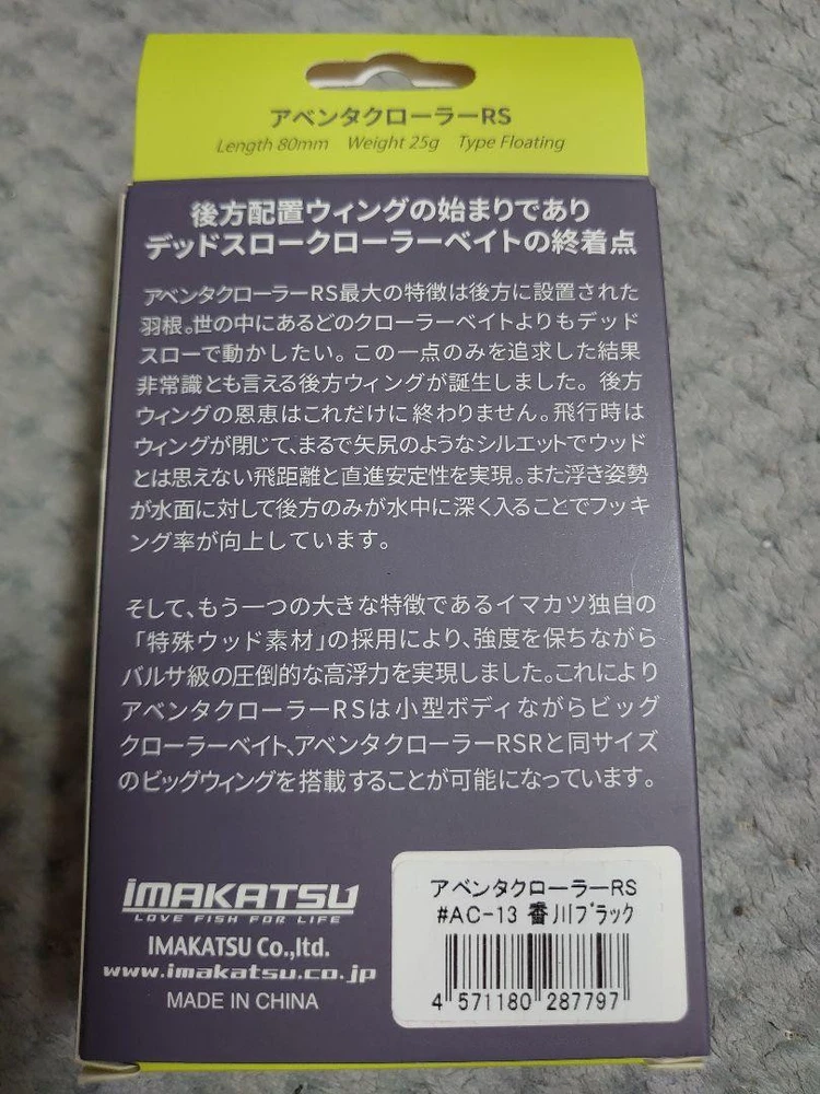 Item Title Fishing Lure Imakatsu Aventa Crawlers Rs Kagawa Black Payment Supports managed payments Please pay within 5 days after auction is finished. About Us We are located in Japan. It's our pleasure to make you happy by proposing our recommend item. If you have any questions or request about items, please feel free to ask us. International Buyers - Please Note: -Import duties, taxes, and charges are not included in the item price or shipping charges. These charges are the buyer's responsibility. -Please check with your country's customs office to determine what these additional costs will be prior to bidding/buying. -These charges are normally collected by the delivering freight (shipping) company or when you pick the item up - do not confuse them for additional shipping charges. -We do not mark merchandise values below value or mark items as - gifts - The US and International government regulations prohibit such behavior. Thank you for your understanding.
