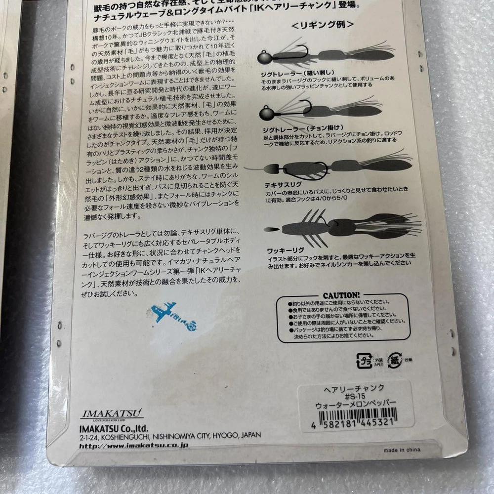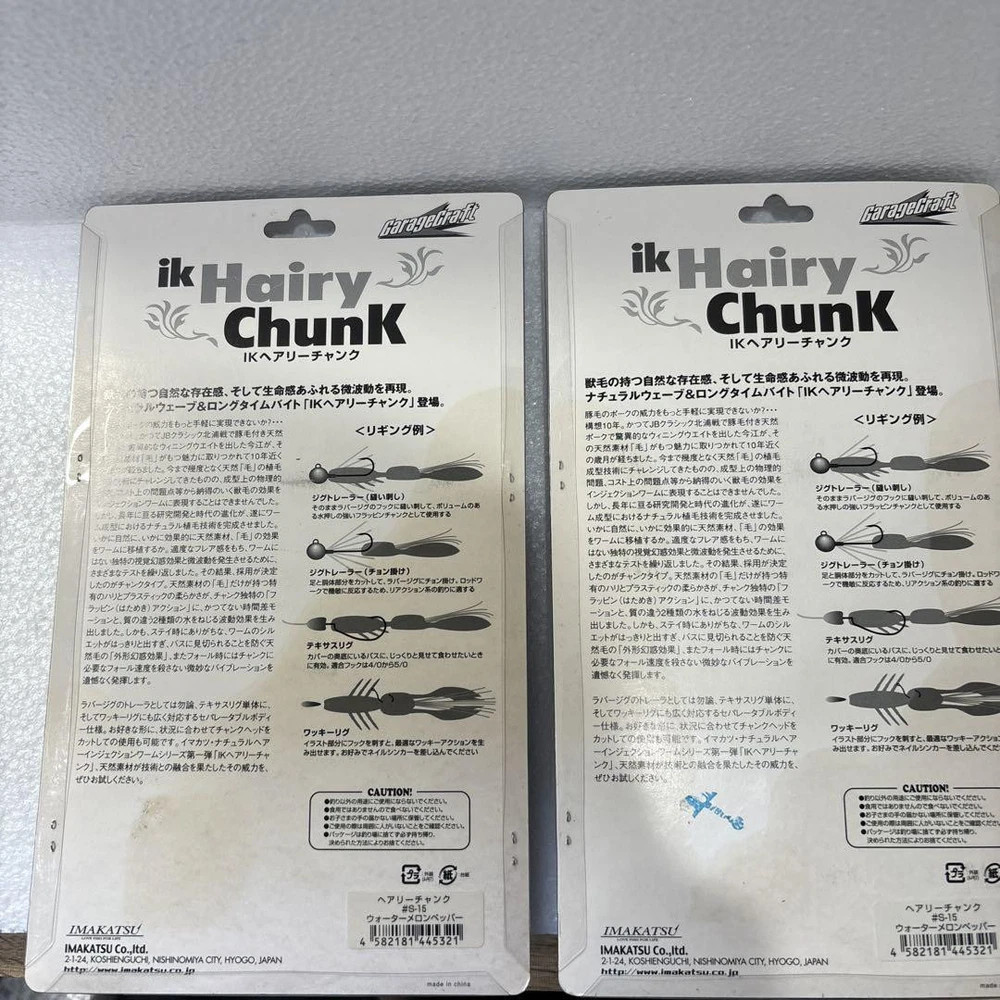 Item Title Fishing Lure Imakatsu Ik Hairy Chunk Watermelon Pepper Set Of 2 Payment Supports managed payments Please pay within 5 days after auction is finished. About Us We are located in Japan. It's our pleasure to make you happy by proposing our recommend item. If you have any questions or request about items, please feel free to ask us. International Buyers - Please Note: -Import duties, taxes, and charges are not included in the item price or shipping charges. These charges are the buyer's responsibility. -Please check with your country's customs office to determine what these additional costs will be prior to bidding/buying. -These charges are normally collected by the delivering freight (shipping) company or when you pick the item up - do not confuse them for additional shipping charges. -We do not mark merchandise values below value or mark items as - gifts - The US and International government regulations prohibit such behavior. Thank you for your understanding.