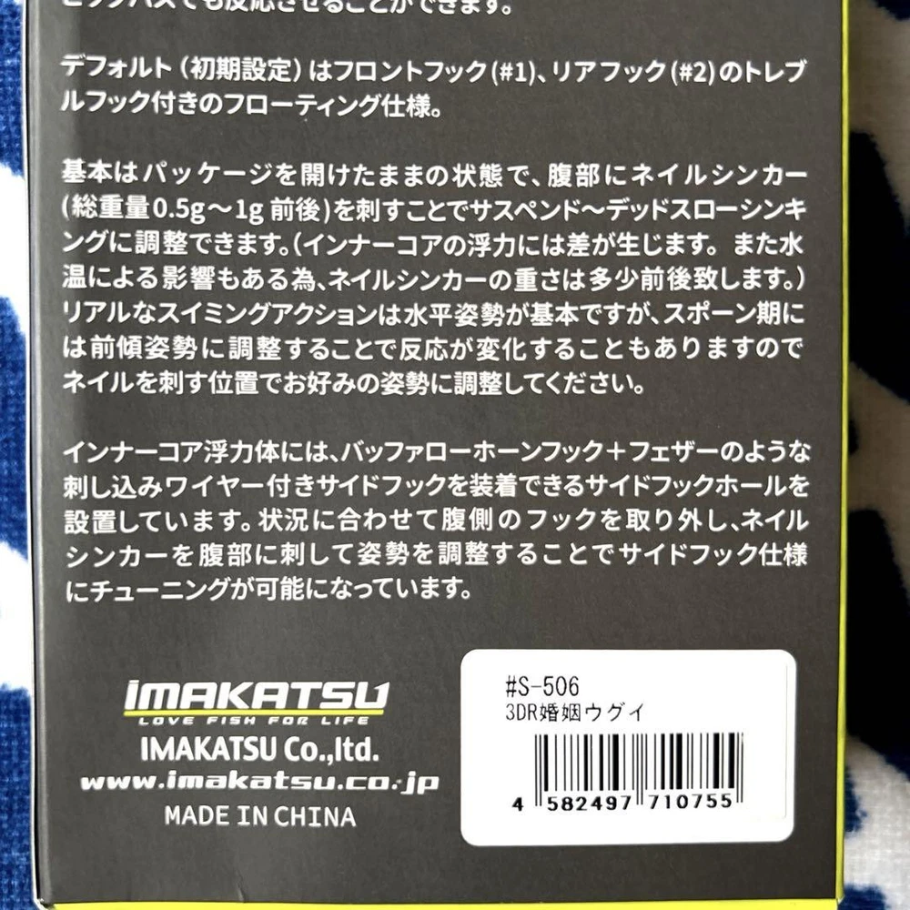 Item Weight: NA MPN: NA Fishing Type: NA Country: Japan Bait Type: NA Country/Region of Manufacture: NA UPC: NA Color: NA Number in Pack: NA Material: NA gtin13: NA Fish Species: NA Maximum Diving Depth: NA Brand: Imakatsu / Imae Katsutaka Buoyancy: NA Model: NA Features: NA Bait Shape: NA Item Length: NA