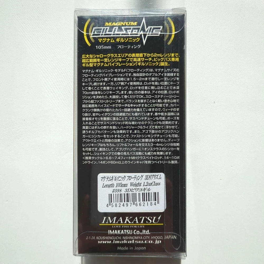 Item Title Fishing Lure Imakatsu Magnum Gillsonic 105Mmf Payment Supports managed payments Please pay within 5 days after auction is finished. About Us We are located in Japan. It's our pleasure to make you happy by proposing our recommend item. If you have any questions or request about items, please feel free to ask us. International Buyers - Please Note: -Import duties, taxes, and charges are not included in the item price or shipping charges. These charges are the buyer's responsibility. -Please check with your country's customs office to determine what these additional costs will be prior to bidding/buying. -These charges are normally collected by the delivering freight (shipping) company or when you pick the item up - do not confuse them for additional shipping charges. -We do not mark merchandise values below value or mark items as - gifts - The US and International government regulations prohibit such behavior. Thank you for your understanding.