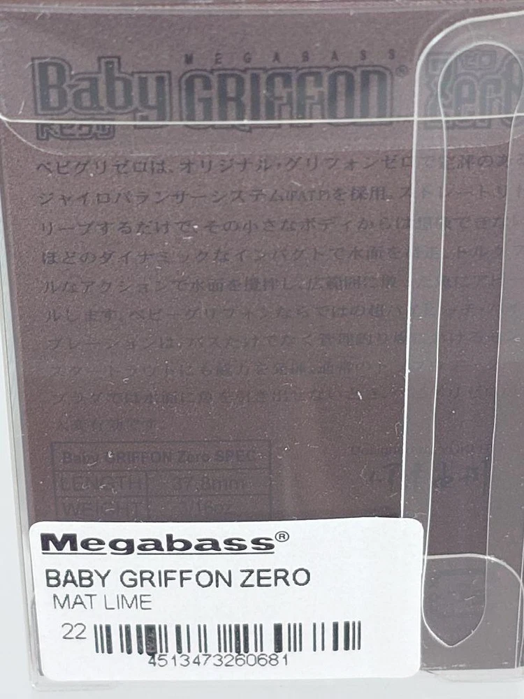 Item Title Fishing Lure Megabass Baby Griffon Zero 2009 Limitedmatte Lime Payment Supports managed payments Please pay within 5 days after auction is finished. About Us We are located in Japan. It's our pleasure to make you happy by proposing our recommend item. If you have any questions or request about items, please feel free to ask us. International Buyers - Please Note: -Import duties, taxes, and charges are not included in the item price or shipping charges. These charges are the buyer's responsibility. -Please check with your country's customs office to determine what these additional costs will be prior to bidding/buying. -These charges are normally collected by the delivering freight (shipping) company or when you pick the item up - do not confuse them for additional shipping charges. -We do not mark merchandise values below value or mark items as - gifts - The US and International government regulations prohibit such behavior. Thank you for your understanding.