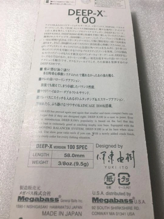 Item Title Fishing Lure Megabass Deep X 100 Custom Color Imc7 Payment Supports managed payments Please pay within 5 days after auction is finished. About Us We are located in Japan. It's our pleasure to make you happy by proposing our recommend item. If you have any questions or request about items, please feel free to ask us. International Buyers - Please Note: -Import duties, taxes, and charges are not included in the item price or shipping charges. These charges are the buyer's responsibility. -Please check with your country's customs office to determine what these additional costs will be prior to bidding/buying. -These charges are normally collected by the delivering freight (shipping) company or when you pick the item up - do not confuse them for additional shipping charges. -We do not mark merchandise values below value or mark items as - gifts - The US and International government regulations prohibit such behavior. Thank you for your understanding.