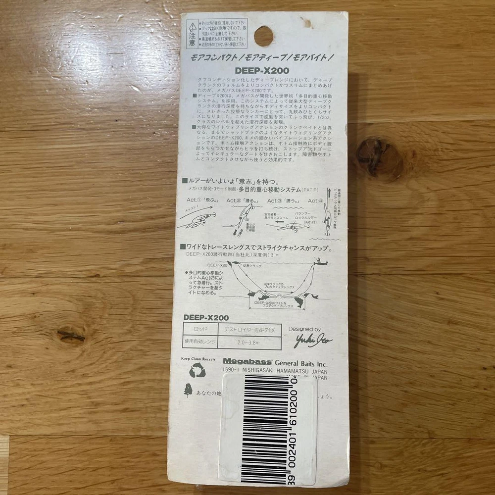 Item Title Fishing Lure Megabass Deep-X200 Deep X200 1999 Payment Supports managed payments Please pay within 5 days after auction is finished. About Us We are located in Japan. It's our pleasure to make you happy by proposing our recommend item. If you have any questions or request about items, please feel free to ask us. International Buyers - Please Note: -Import duties, taxes, and charges are not included in the item price or shipping charges. These charges are the buyer's responsibility. -Please check with your country's customs office to determine what these additional costs will be prior to bidding/buying. -These charges are normally collected by the delivering freight (shipping) company or when you pick the item up - do not confuse them for additional shipping charges. -We do not mark merchandise values below value or mark items as - gifts - The US and International government regulations prohibit such behavior. Thank you for your understanding.