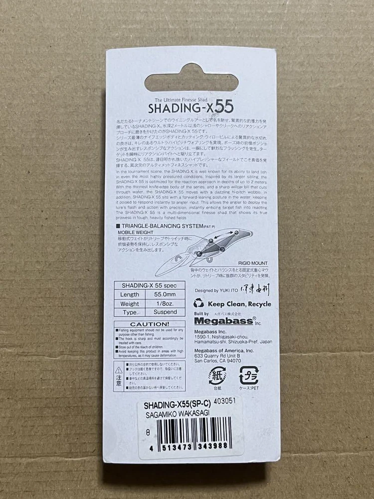 Item Title Fishing Lure Megabass Shading X55 Shading-X55 Sp-C Payment Supports managed payments Please pay within 5 days after auction is finished. About Us We are located in Japan. It's our pleasure to make you happy by proposing our recommend item. If you have any questions or request about items, please feel free to ask us. International Buyers - Please Note: -Import duties, taxes, and charges are not included in the item price or shipping charges. These charges are the buyer's responsibility. -Please check with your country's customs office to determine what these additional costs will be prior to bidding/buying. -These charges are normally collected by the delivering freight (shipping) company or when you pick the item up - do not confuse them for additional shipping charges. -We do not mark merchandise values below value or mark items as - gifts - The US and International government regulations prohibit such behavior. Thank you for your understanding.