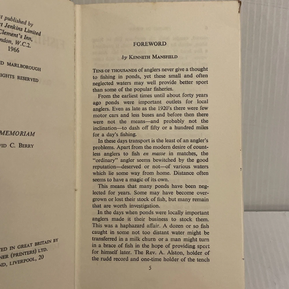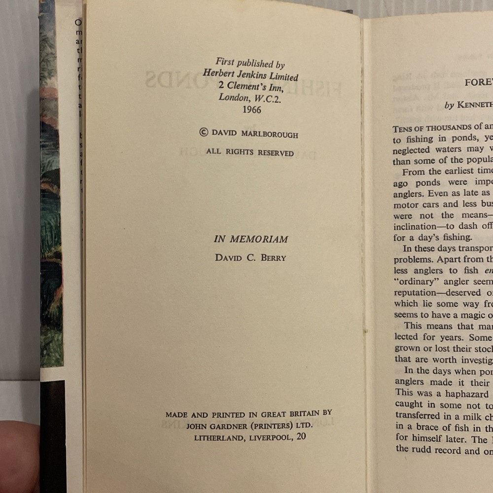 Fishing in Ponds Theory and Practice - David Marlborough 1966 1st Edition Hardback Book with Dust Jacket Published in 1966 by Herbert Jenkins as part of the “How to Catch Them” series, David Marlborough’s Fishing in Ponds: Theory and Practice is a scarce and highly collectable title. From general considerations of tackle and water types to detailed accounts of carp, tench, roach, rudd, perch, pike, and eels. Illustrated with black‑and‑white drawings, it also includes an appendix reflecting on the severe winter freeze of 1962–63 and its impact on pond fishing. Condition: VINTAGE GOOD - Photo's of Actual Product - See photos to confirm condition All pages present and a fully intact cover. Shows significant wear, including wear to the dust jacket, boards & textblock. Binding intact, shelfwear and bumps. Dustjacket present, with wear and tears. Some tanning & foxing. ------------------- Please See my eBay shop for more Modern & Vintage Books Add as a favourite seller, new stock added daily Thanks for looking